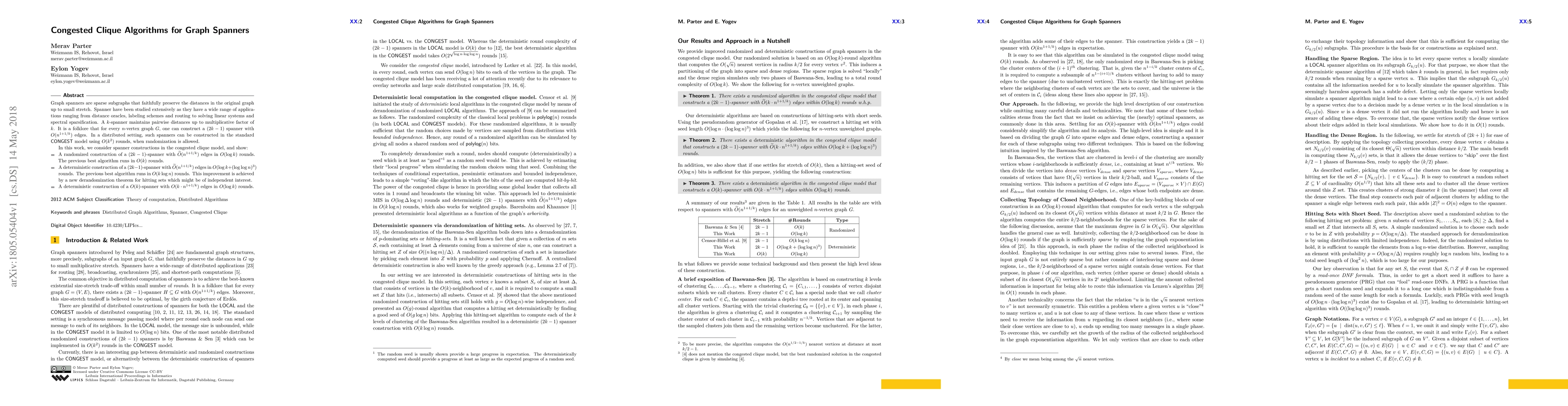 Graph spanners are sparse subgraphs that faithfully preserve the distances in the original graph up to small stretch. Spanner have been studied extensively as they have a wide range of applications ranging from distance oracles, labeling schemes and routing to solving linear systems and spectral sparsification. A $k$-spanner maintains pairwise distances up to multiplicative factor of $k$. It is a folklore that for every $n$-vertex graph $G$, one can construct a $(2k-1)$ spanner with $O(n^{1+1/k})$ edges. In a distributed setting, such spanners can be constructed in the standard CONGEST model using $O(k^2)$ rounds, when randomization is allowed. In this work, we consider spanner constructions in the congested clique model, and show: (1) A randomized construction of a $(2k-1)$-spanner with $\widetilde{O}(n^{1+1/k})$ edges in $O(\log k)$ rounds. The previous best algorithm runs in $O(k)$ rounds. (2) A deterministic construction of a $(2k-1)$-spanner with $\widetilde{O}(n^{1+1/k})$ edges in $O(\log k +(\log\log n)^3)$ rounds. The previous best algorithm runs in $O(k\log n)$ rounds. This improvement is achieved by a new derandomization theorem for hitting sets which might be of independent interest. (3) A deterministic construction of a $O(k)$-spanner with $O(k \cdot n^{1+1/k})$ edges in $O(\log k)$ rounds.