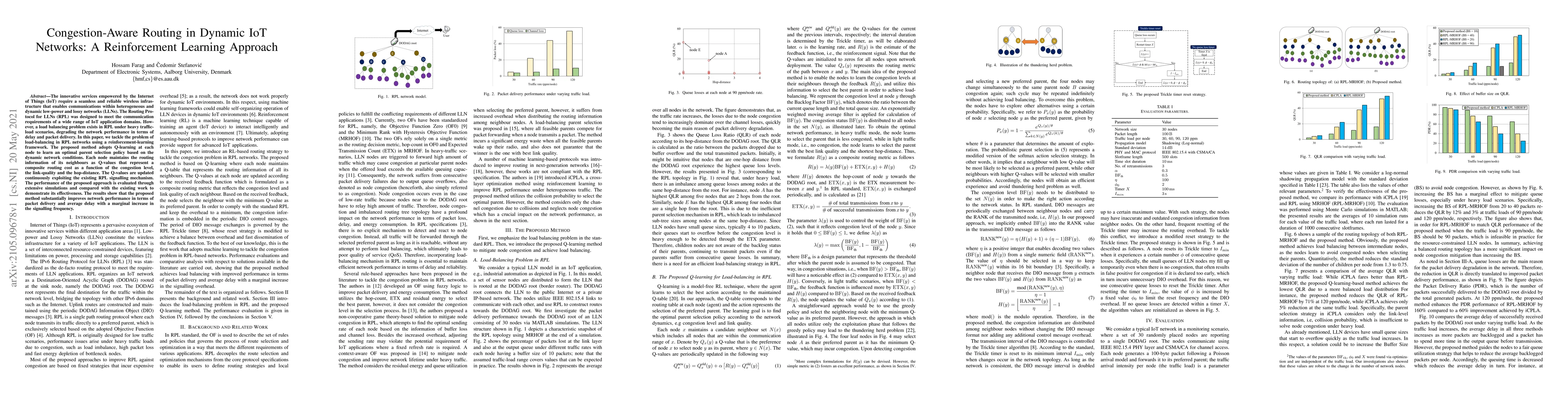 This paper proposes a reinforcement learning approach using Q-learning to optimize parent selection in Routing Protocol for Low-Power and Lossy Networks (RPL) to address load-balancing issues under heavy traffic. The method enhances network performance by dynamically updating routing information based on congestion, link quality, and hop distance.