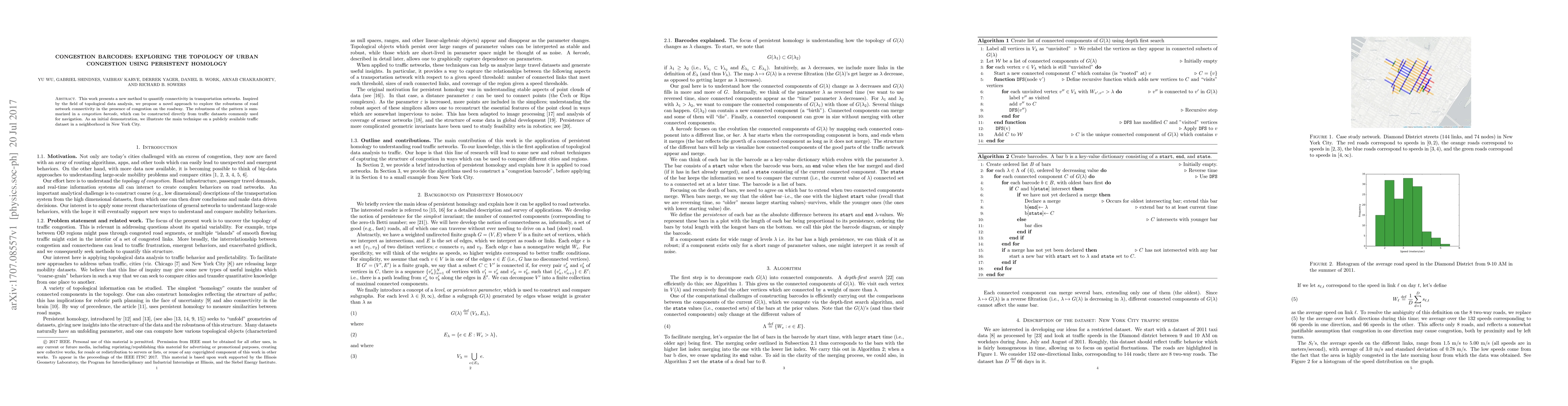 This work presents a new method to quantify connectivity in transportation networks. Inspired by the field of topological data analysis, we propose a novel approach to explore the robustness of road network connectivity in the presence of congestion on the roadway. The robustness of the pattern is summarized in a congestion barcode, which can be constructed directly from traffic datasets commonly used for navigation. As an initial demonstration, we illustrate the main technique on a publicly available traffic dataset in a neighborhood in New York City.