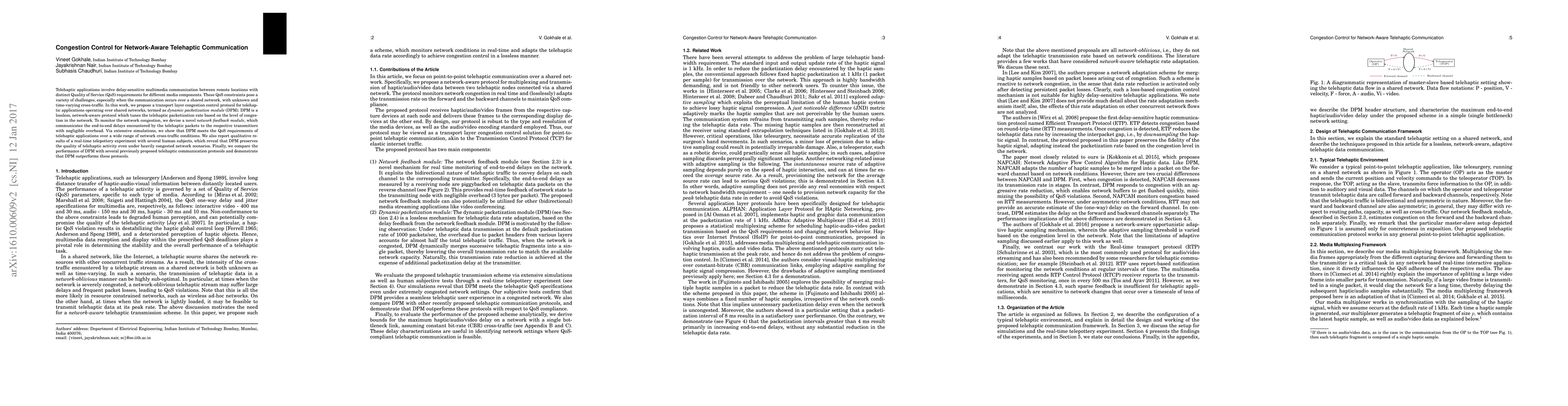 This paper proposes a dynamic packetization module (DPM) for congestion control in telehaptic communication over shared networks, which adjusts packetization rates based on network congestion. The DPM protocol, supported by a network feedback module, maintains Quality of Service (QoS) requirements and outperforms existing protocols, as demonstrated through extensive simulations and real-time telepottery experiments.