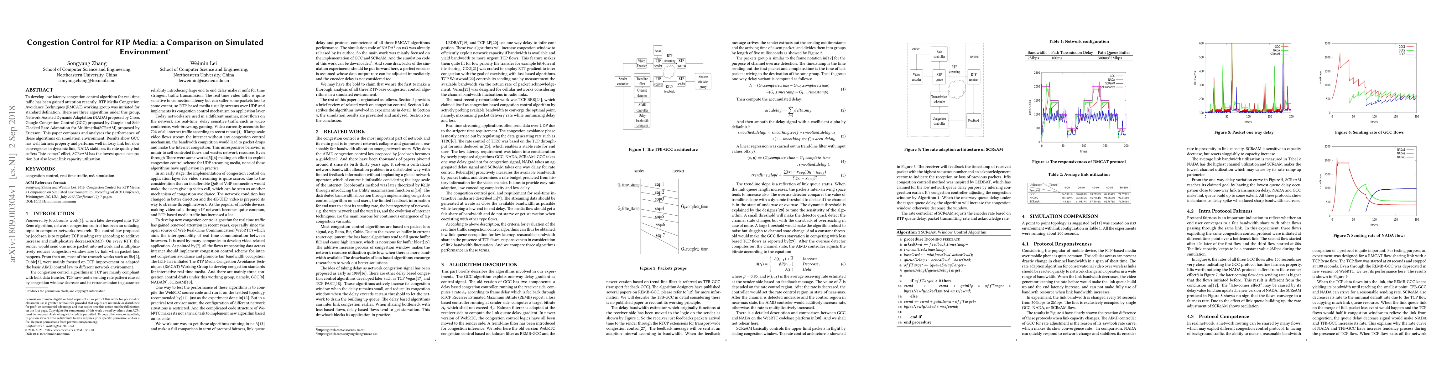 This study compares three congestion control algorithms for real-time media transmission, analyzing their performance in simulated environments. Results indicate that Google Congestion Control offers good fairness and handles lossy links well, while other algorithms have different strengths and limitations in stability and link utilization.
