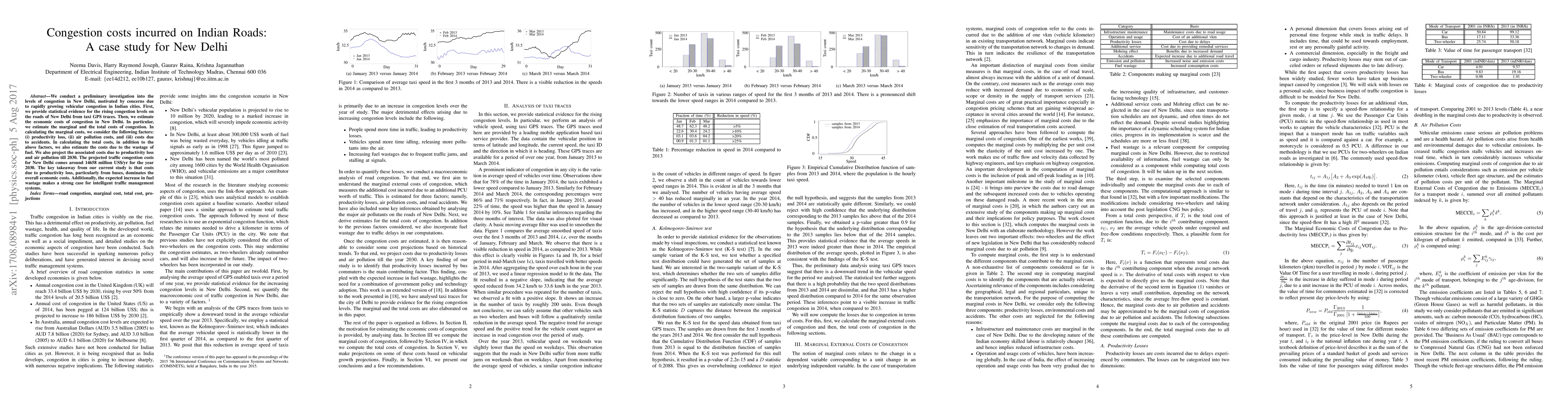 This study investigates rising congestion in New Delhi using taxi GPS data, estimating significant economic costs including productivity loss, air pollution, and accidents. Projected congestion costs by 2030 are around 14,658 million US$/yr, with productivity loss from buses being the largest contributor.