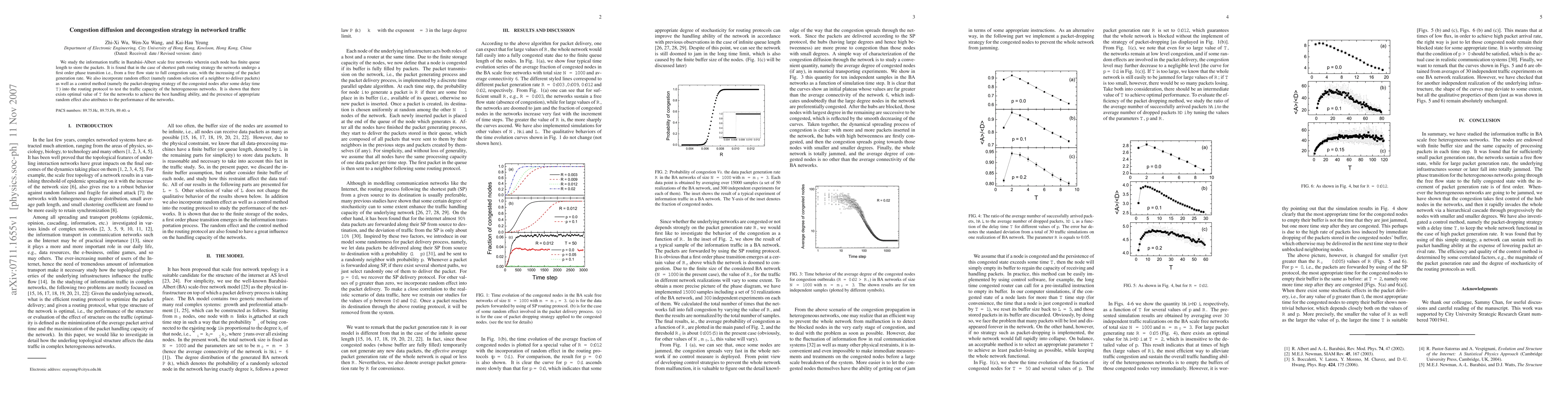 We study the information traffic in Barab\'asi-Albert scale free networks wherein each node has finite queue length to store the packets. It is found that in the case of shortest path routing strategy the networks undergo a first order phase transition i.e., from a free flow state to full congestion sate, with the increasing of the packet generation rate. We also incorporate random effect (namely random selection of a neighbor to deliver packets) as well as a control method (namely the packet-dropping strategy of the congested nodes after some delay time $T$) into the routing protocol to test the traffic capacity of the heterogeneous networks. It is shown that there exists optimal value of $T$ for the networks to achieve the best handling ability, and the presence of appropriate random effect also attributes to the performance of the networks.