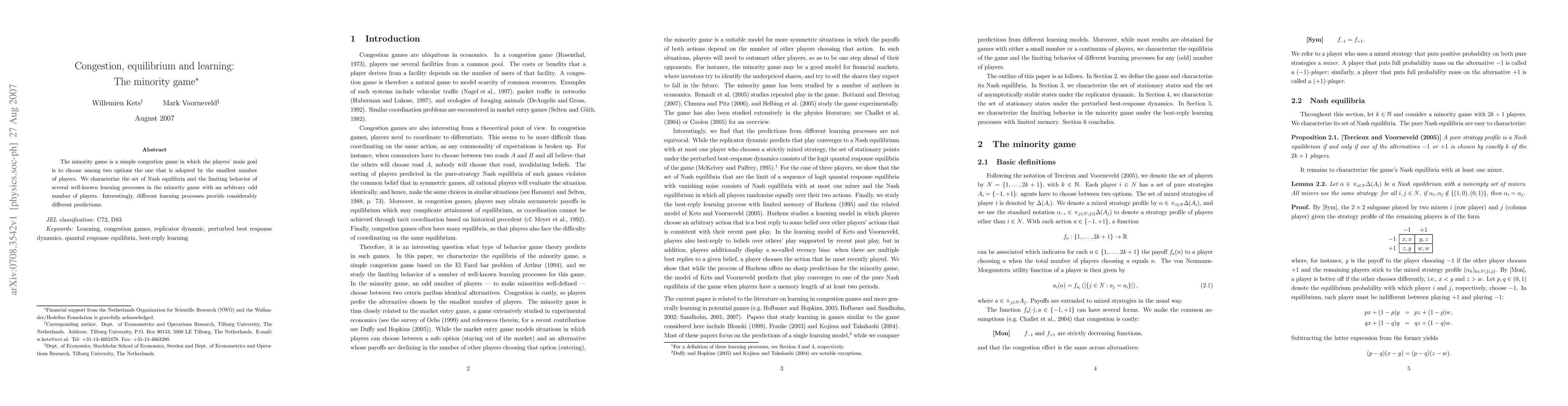 The minority game involves players choosing the least chosen option to avoid congestion; the paper characterizes its Nash equilibria and analyzes the behavior of various learning processes, revealing significant differences in their predictions.