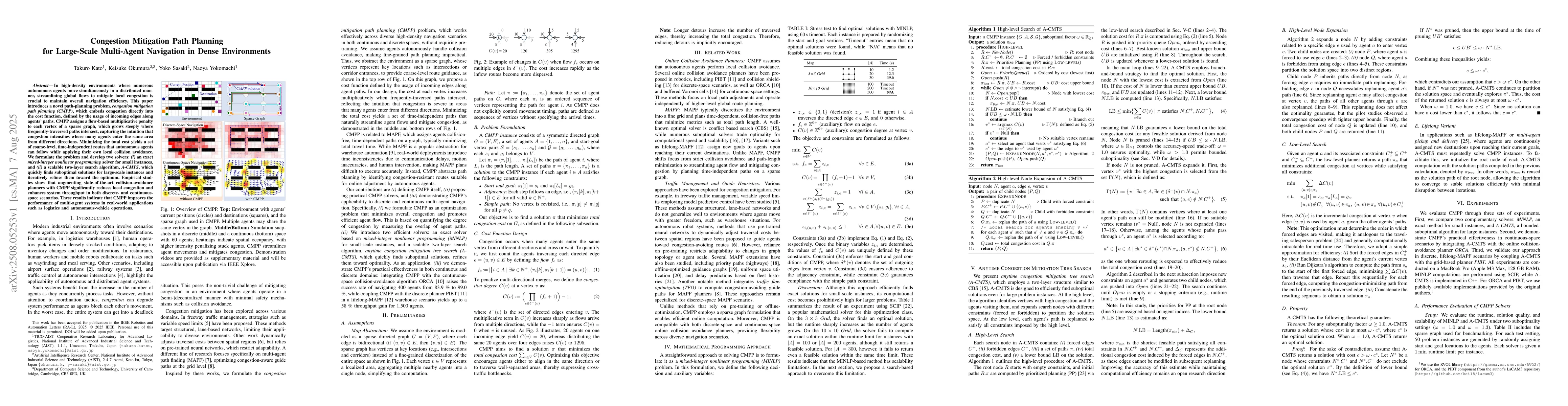 In high-density environments where numerous autonomous agents move simultaneously in a distributed manner, streamlining global flows to mitigate local congestion is crucial to maintain overall navigation efficiency. This paper introduces a novel path-planning problem, congestion mitigation path planning (CMPP), which embeds congestion directly into the cost function, defined by the usage of incoming edges along agents' paths. CMPP assigns a flow-based multiplicative penalty to each vertex of a sparse graph, which grows steeply where frequently-traversed paths intersect, capturing the intuition that congestion intensifies where many agents enter the same area from different directions. Minimizing the total cost yields a set of coarse-level, time-independent routes that autonomous agents can follow while applying their own local collision avoidance. We formulate the problem and develop two solvers: (i) an exact mixed-integer nonlinear programming solver for small instances, and (ii) a scalable two-layer search algorithm, A-CMTS, which quickly finds suboptimal solutions for large-scale instances and iteratively refines them toward the optimum. Empirical studies show that augmenting state-of-the-art collision-avoidance planners with CMPP significantly reduces local congestion and enhances system throughput in both discrete- and continuous-space scenarios. These results indicate that CMPP improves the performance of multi-agent systems in real-world applications such as logistics and autonomous-vehicle operations.