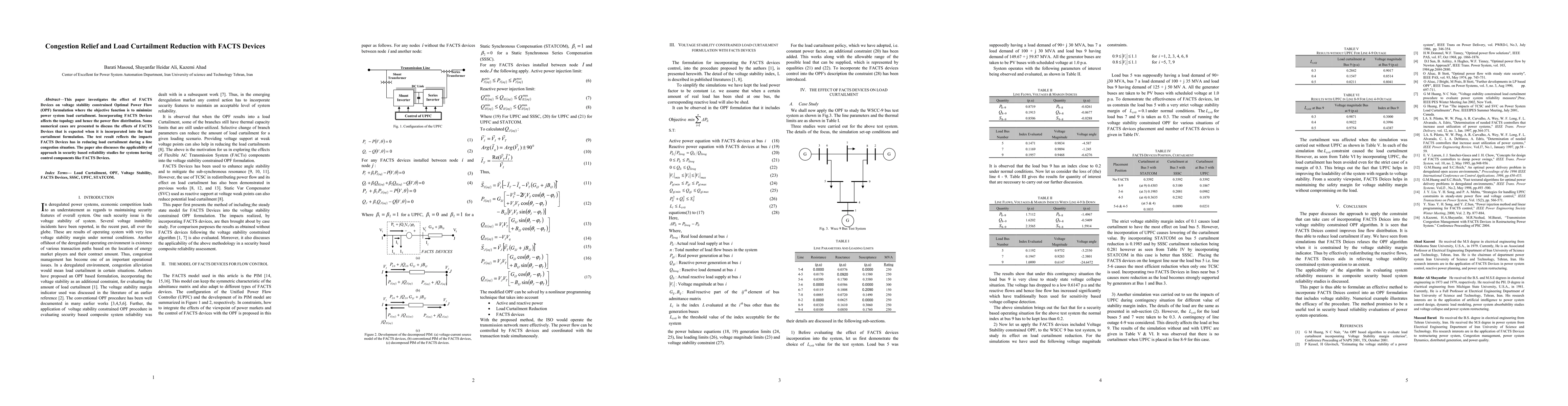 This paper explores how Flexible AC Transmission Systems (FACTS) Devices enhance voltage stability in optimal power flow, aiming to minimize load curtailment, and demonstrates their effectiveness in reducing load curtailment during congestion through numerical cases. The study also assesses the approach's applicability in security-based reliability studies involving control components like FACTS Devices.