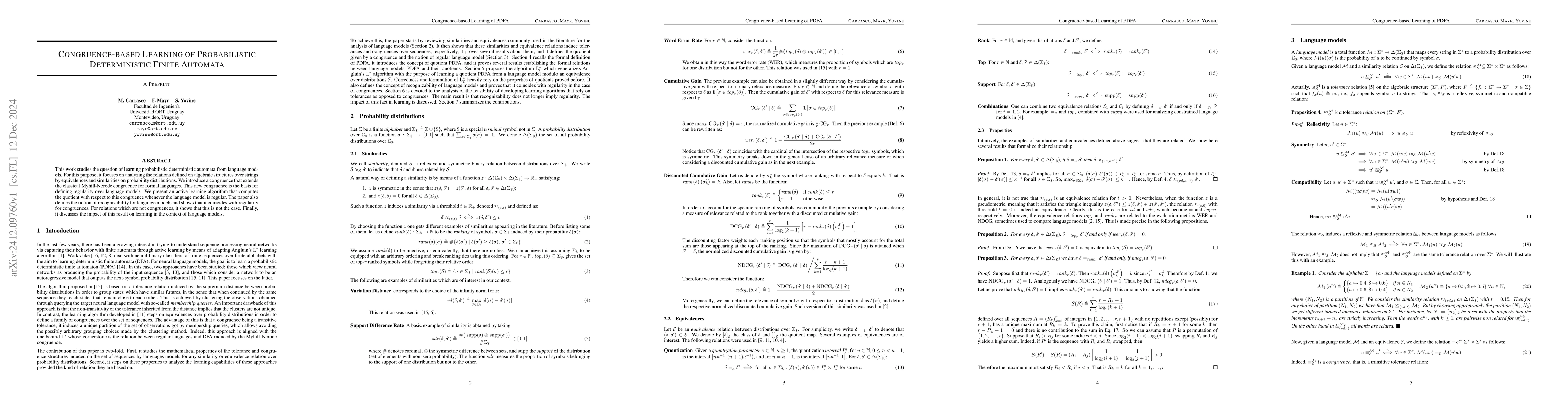 This work studies the question of learning probabilistic deterministic automata from language models. For this purpose, it focuses on analyzing the relations defined on algebraic structures over strings by equivalences and similarities on probability distributions. We introduce a congruence that extends the classical Myhill-Nerode congruence for formal languages. This new congruence is the basis for defining regularity over language models. We present an active learning algorithm that computes the quotient with respect to this congruence whenever the language model is regular. The paper also defines the notion of recognizability for language models and shows that it coincides with regularity for congruences. For relations which are not congruences, it shows that this is not the case. Finally, it discusses the impact of this result on learning in the context of language models.