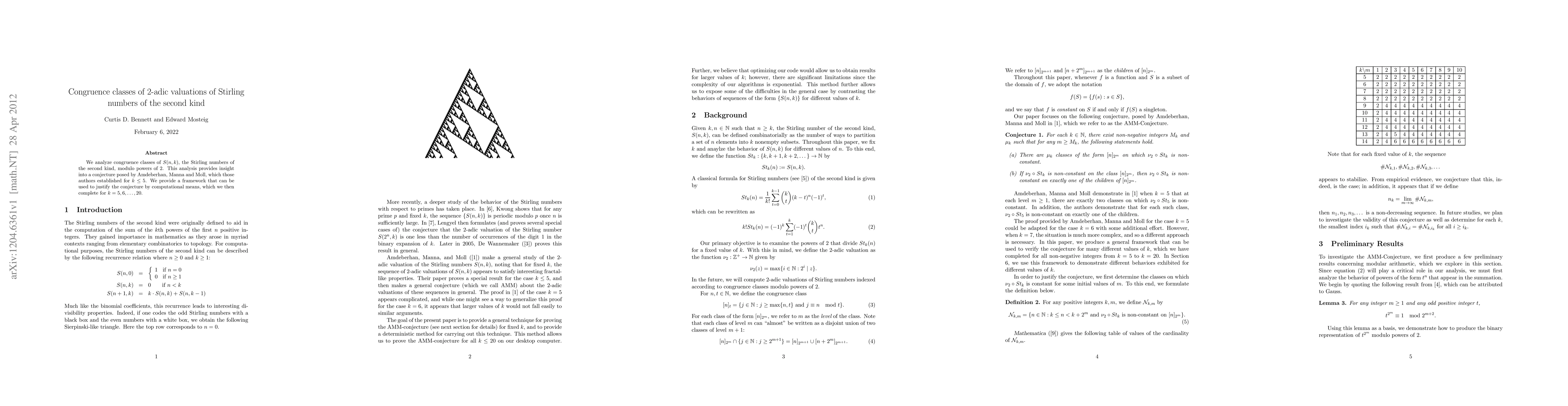 We analyze congruence classes of $S(n,k)$, the Stirling numbers of the second kind, modulo powers of 2. This analysis provides insight into a conjecture posed by Amdeberhan, Manna and Moll, which those authors established for $k\le5$. We provide a framework that can be used to justify the conjecture by computational means, which we then complete for $k=5, 6,..., 20$.