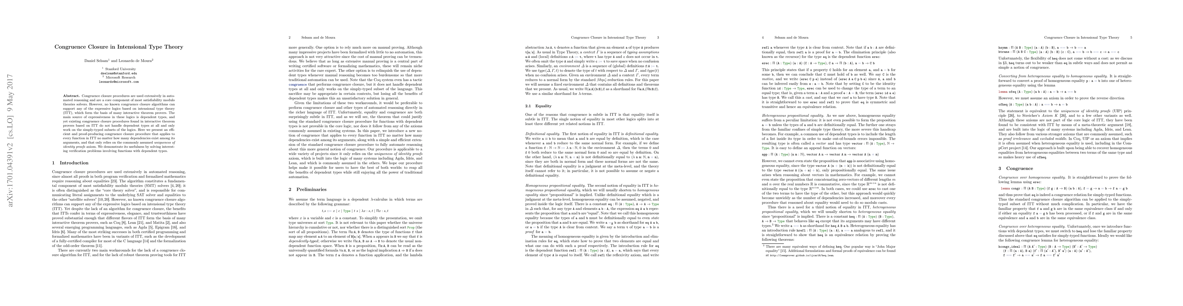 This paper introduces an efficient congruence closure procedure for intensional type theory (ITT), addressing the lack of support for expressive logics with dependent types. It demonstrates the procedure's effectiveness in solving verification problems involving functions with dependent types.