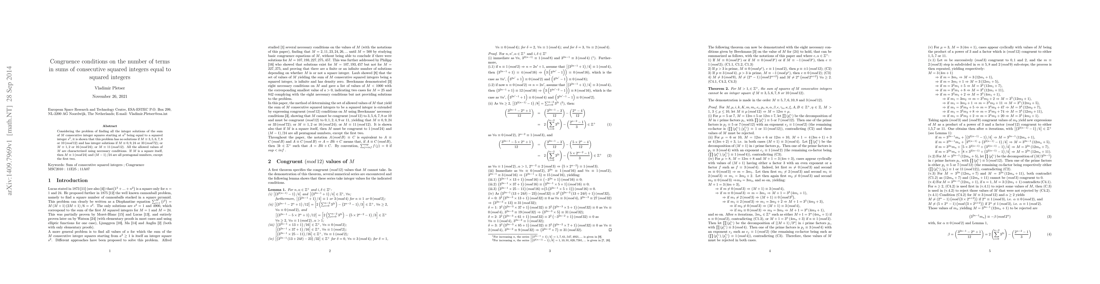Considering the problem of finding all the integer solutions of the sum of $M$ consecutive integer squares starting at $a^{2}$ being equal to a squared integer $s^{2}$, it is shown that this problem has no solutions if $M\equiv3,5,6,7,8$ or $10 (mod\,12)$ and has integer solutions if $M\equiv0,9,24$ or $33 (mod\,72)$; or $M\equiv1,2$ or $16 (mod\,24)$; or $M\equiv11 (mod\,12)$. All the allowed values of $M$ are characterized using necessary conditions. If $M$ is a square itself, then $M\equiv1 (mod\,24)$ and $(M-1)/24$ are all pentagonal numbers, except the first two.