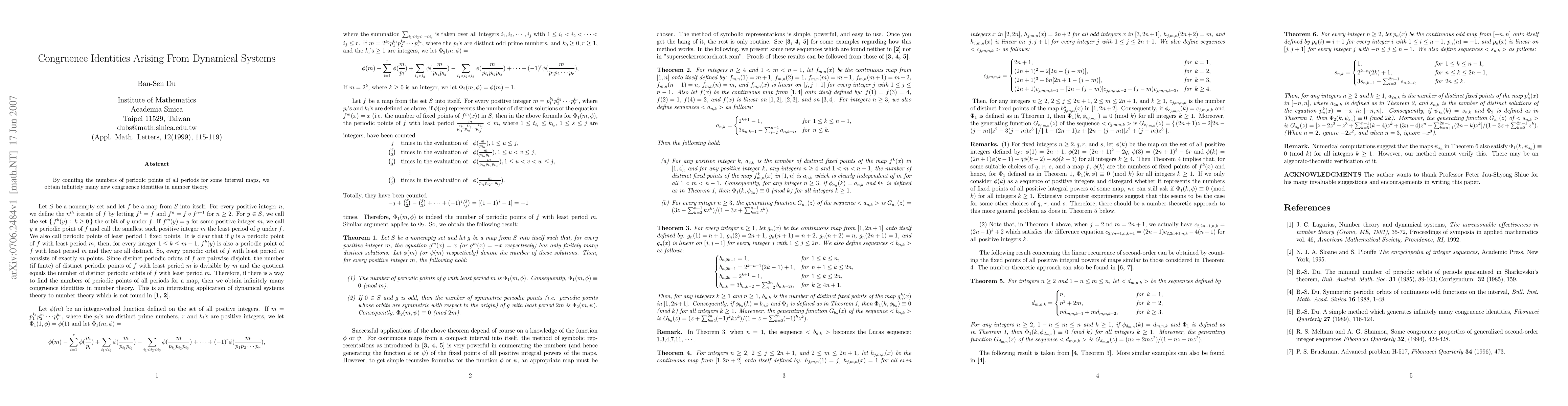 This paper explores dynamical systems to derive new congruence identities in number theory by analyzing periodic points of interval maps, revealing a rich connection between dynamical systems and number theory.
