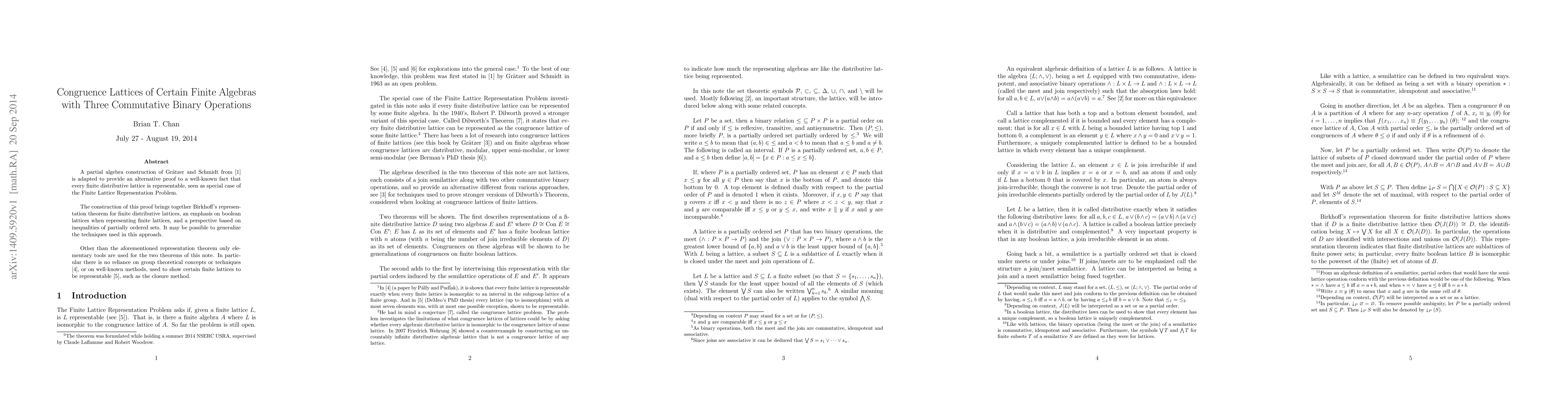 A partial algebra construction of Gr\"atzer and Schmidt from "Characterizations of congruence lattices of abstract algebras" (Acta Sci. Math. (Szeged) 24 (1963), 34-59) is adapted to provide an alternative proof to a well-known fact that every finite distributive lattice is representable, seen as a special case of the Finite Lattice Representation Problem. The construction of this proof brings together Birkhoff's representation theorem for finite distributive lattices, an emphasis on boolean lattices when representing finite lattices, and a perspective based on inequalities of partially ordered sets. It may be possible to generalize the techniques used in this approach. Other than the aforementioned representation theorem only elementary tools are used for the two theorems of this note. In particular there is no reliance on group theoretical concepts or techniques (see P\'eter P\'al P\'alfy and Pavel Pud\'lak), or on well-known methods, used to show certain finite lattice to be representable (see William J. DeMeo), such as the closure method.
