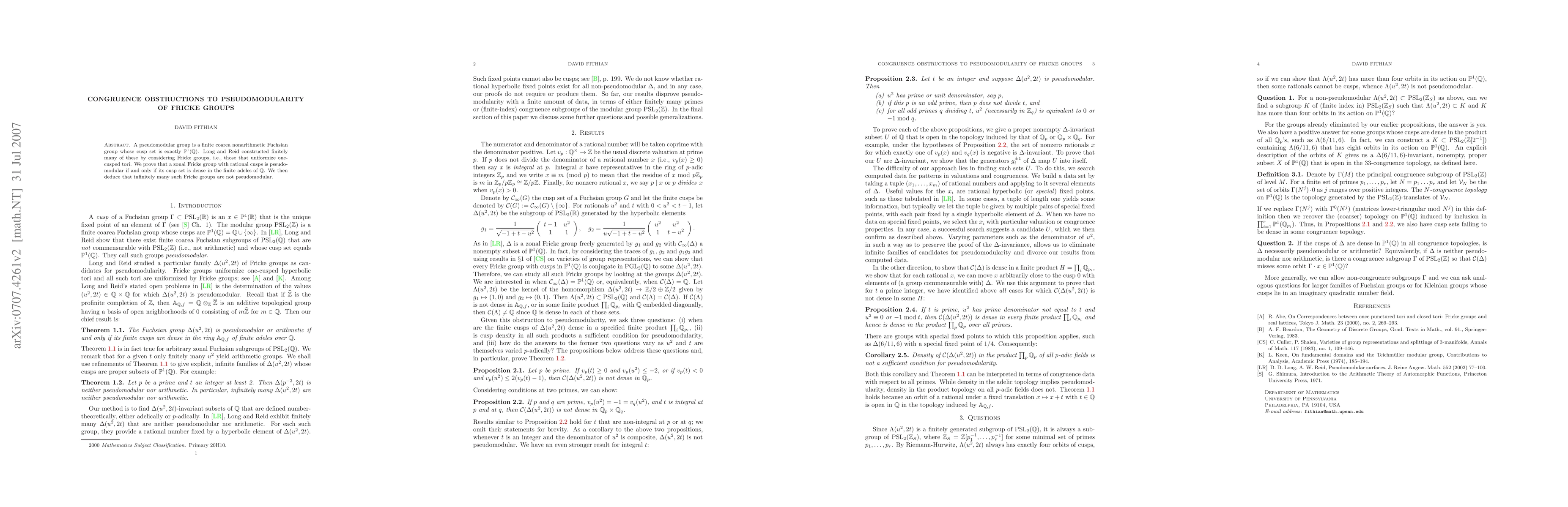 This paper proves that a zonal Fricke group is pseudomodular if its cusp set is dense in the finite adeles of Q, and shows that infinitely many such groups are not pseudomodular.