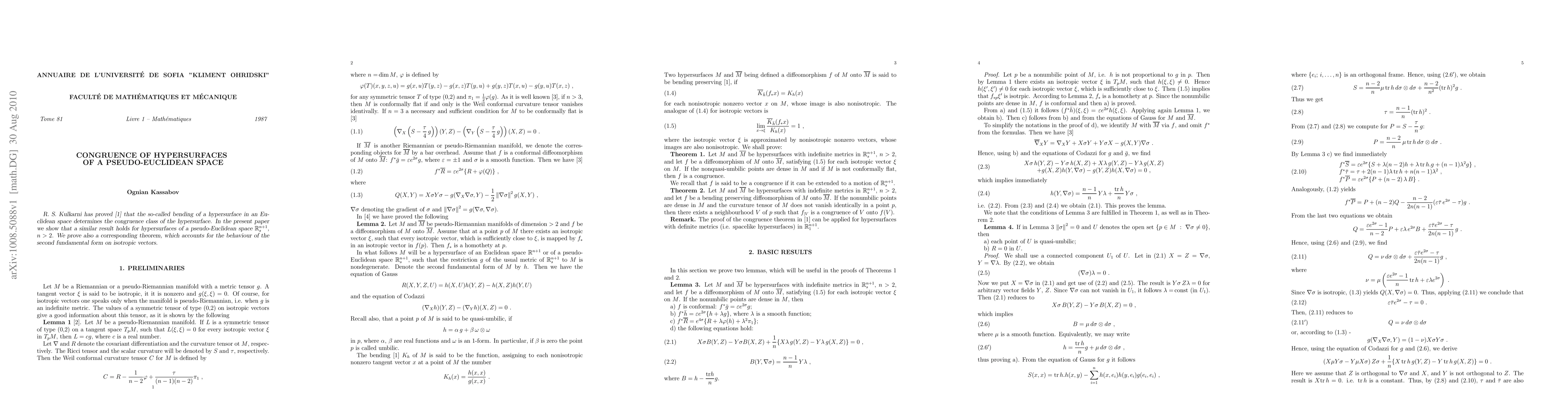 Summary: This paper investigates conditions related to the bending problem for hypersurfaces within a pseudo-Euclidean space, and proves corresponding theorems that address these conditions.