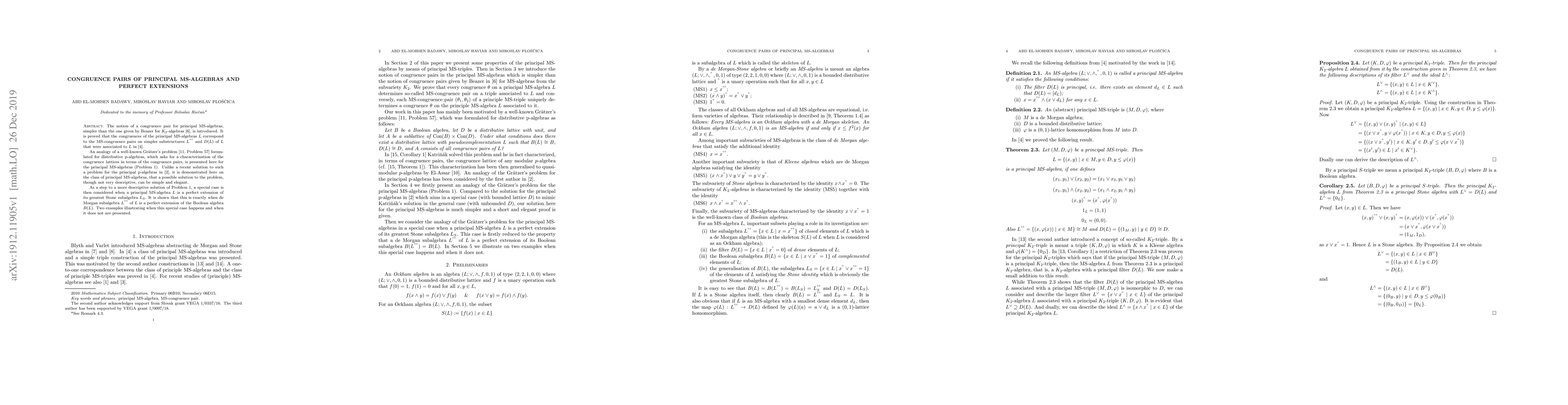 This paper introduces the concept of congruence pairs for principal MS-algebras, showing that their congruences correspond to MS-congruence pairs on substructures. It also presents a simplified Grätzer's problem for these algebras, demonstrating a solution that is elegant but not descriptive. Additionally, it explores the special case where a principal MS-algebra is a perfect extension of its greatest Stone subalgebra, linking this to the de Morgan subalgebra being a perfect extension of the associated Boolean algebra.