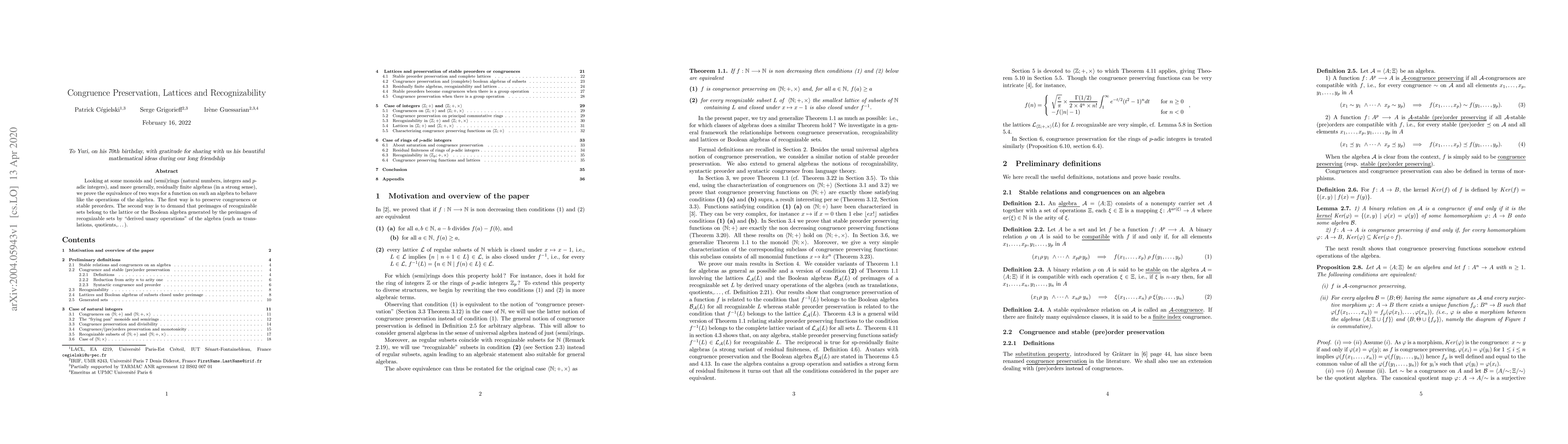 Looking at some monoids and (semi)rings (natural numbers, integers and p-adic integers), and more generally, residually finite algebras (in a strong sense), we prove the equivalence of two ways for a function on such an algebra to behave like the operations of the algebra. The first way is to preserve congruences or stable preorders. The second way is to demand that preimages of recognizable sets belong to the lattice or the Boolean algebra generated by the preimages of recognizable sets by derived unary operation of the algebra (such as translations, quotients,. . . ).