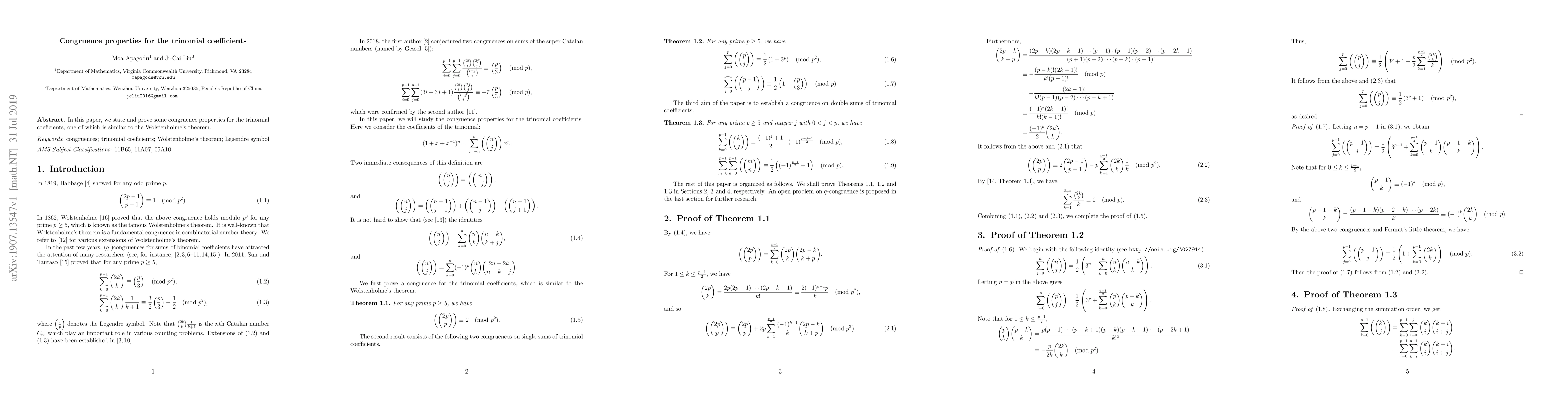 This paper establishes congruence properties for trinomial coefficients, including a theorem similar to Wolstenholme's theorem, providing new insights into number theory.
