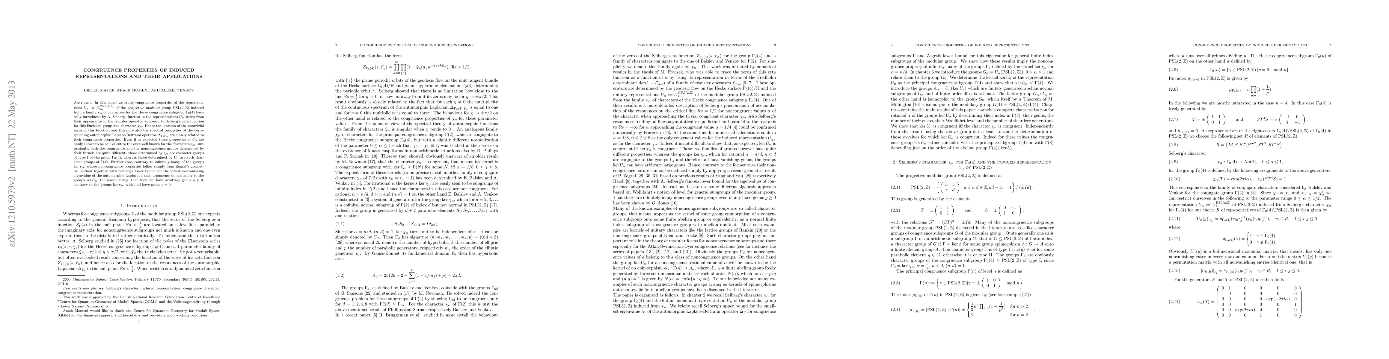 In this paper we study congruence properties of the representations $U_\alpha:=U^{PSL(2,\mathbb{Z})}_{\chi_\alpha}$ of the projective modular group ${\rm PSL}(2,\mathbb{Z})$ induced from a family $\chi_\alpha$ of characters for the Hecke congruence subgroup $\Gamma_0(4)$ basically introduced by A. Selberg. Interest in the representations $U_\alpha$ stems from their appearance in the transfer operator approach to Selberg's zeta function for this Fuchsian group and character $\chi_\alpha$. Hence the location of the nontrivial zeros of this function and therefore also the spectral properties of the corresponding automorphic Laplace-Beltrami operator $\Delta_{\Gamma,\chi_\alpha}$ are closely related to their congruence properties. Even if as expected these properties of $U_\alpha$ are easily shown to be equivalent to the ones well known for the characters $\chi_\alpha$, surprisingly, both the congruence and the noncongruence groups determined by their kernels are quite different: those determined by $\chi_\alpha$ are character groups of type I of the group $\Gamma_0(4)$, whereas those determined by $U_\alpha$ are such character groups of $\Gamma(4)$. Furthermore, contrary to infinitely many of the groups $\ker \chi_\alpha $, whose noncongruence properties follow simply from Zograf's geometric method together with Selberg's lower bound for the lowest nonvanishing eigenvalue of the automorphic Laplacian, such arguments do not apply to the groups $\ker U_\alpha$, the reason being, that they can have arbitrary genus $g\geq 0$, contrary to the groups $\ker \chi_\alpha$, which all have genus $g=0$.