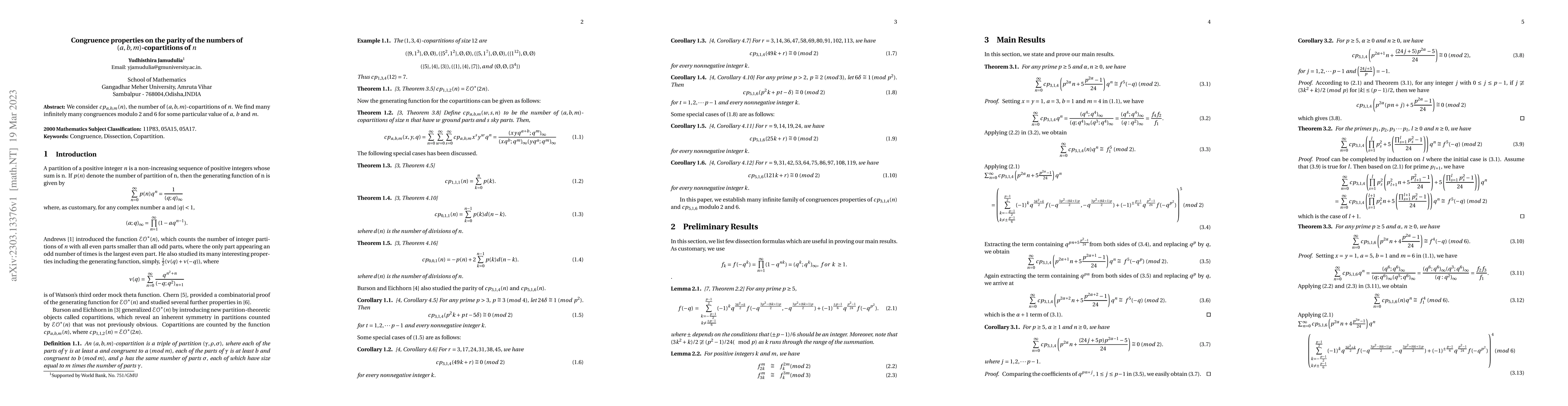 Summary: This paper explores the number of $(a,b,m)$-copartitions of $n$, denoted as $cp_{a,b,m}(n)$, and discovers numerous congruence properties regarding the parity of these copartitions, particularly modulo 2 and 6 for specific values of $a$, $b$, and $m$.