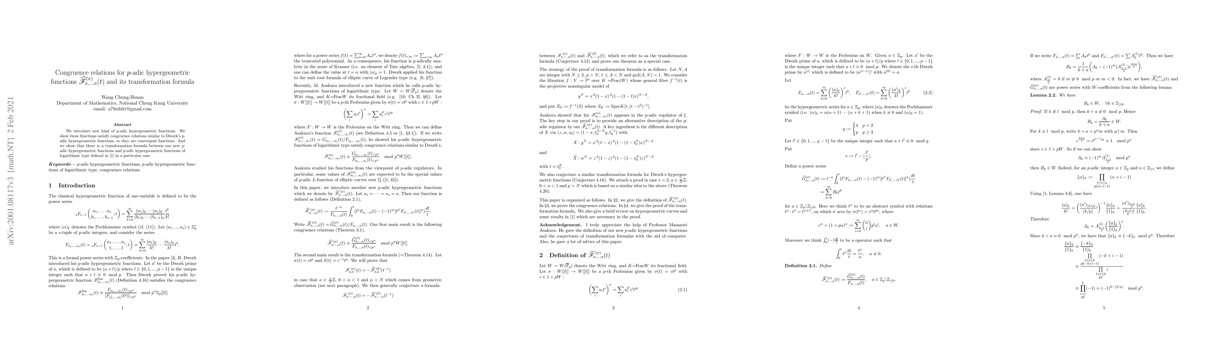 We introduce new kind of $p$-adic hypergeometric functions. We show these functions satisfy congruence relations, so they are convergent functions. And we show that there is a transformation formula between our new $p$-adic hypergeometric functions and $p$-adic hypergeometric functions of logarithmic type defined by M. Asakura in a particular case.