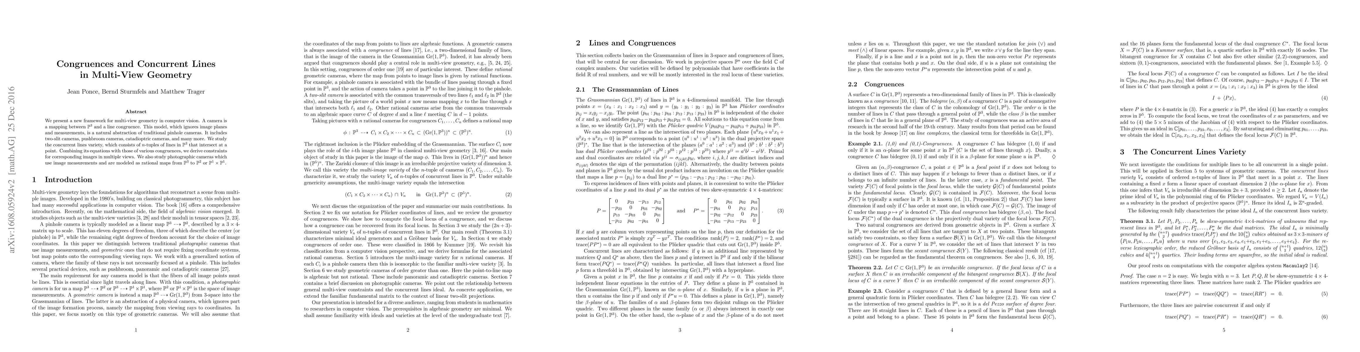 We present a new framework for multi-view geometry in computer vision. A camera is a mapping between $\mathbb{P}^3$ and a line congruence. This model, which ignores image planes and measurements, is a natural abstraction of traditional pinhole cameras. It includes two-slit cameras, pushbroom cameras, catadioptric cameras, and many more. We study the concurrent lines variety, which consists of $n$-tuples of lines in $\mathbb{P}^3$ that intersect at a point. Combining its equations with those of various congruences, we derive constraints for corresponding images in multiple views. We also study photographic cameras which use image measurements and are modeled as rational maps from $\mathbb{P}^3$ to $\mathbb{P}^2$ or $\mathbb{P}^1\times \mathbb{P}^1$.