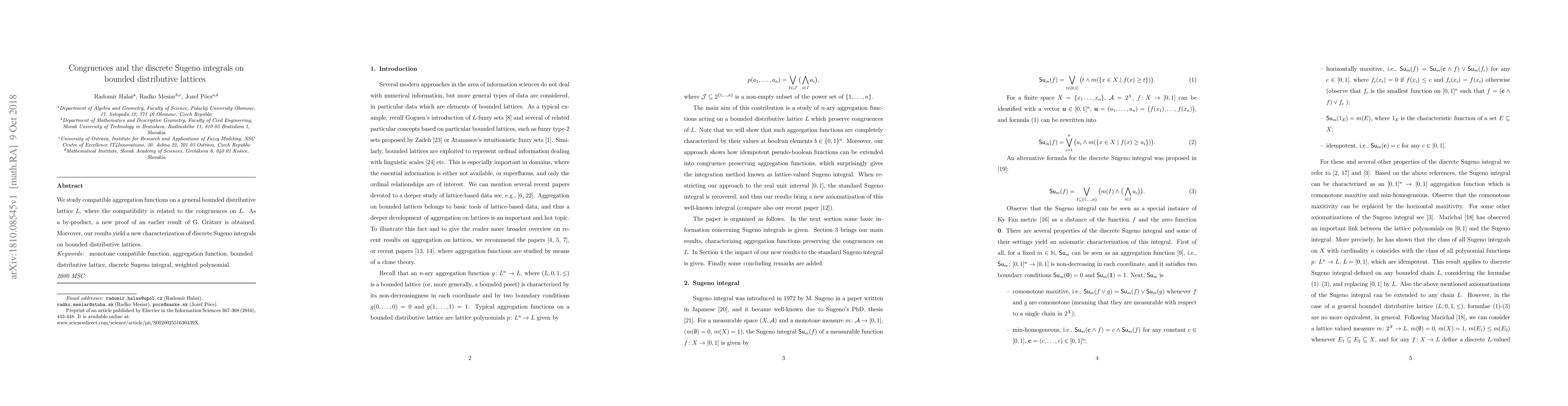 This paper explores compatible aggregation functions on bounded distributive lattices, linking them to congruences, and provides a new proof for a prior result by Grätzer. Additionally, it offers a novel characterization of discrete Sugeno integrals on these lattices.