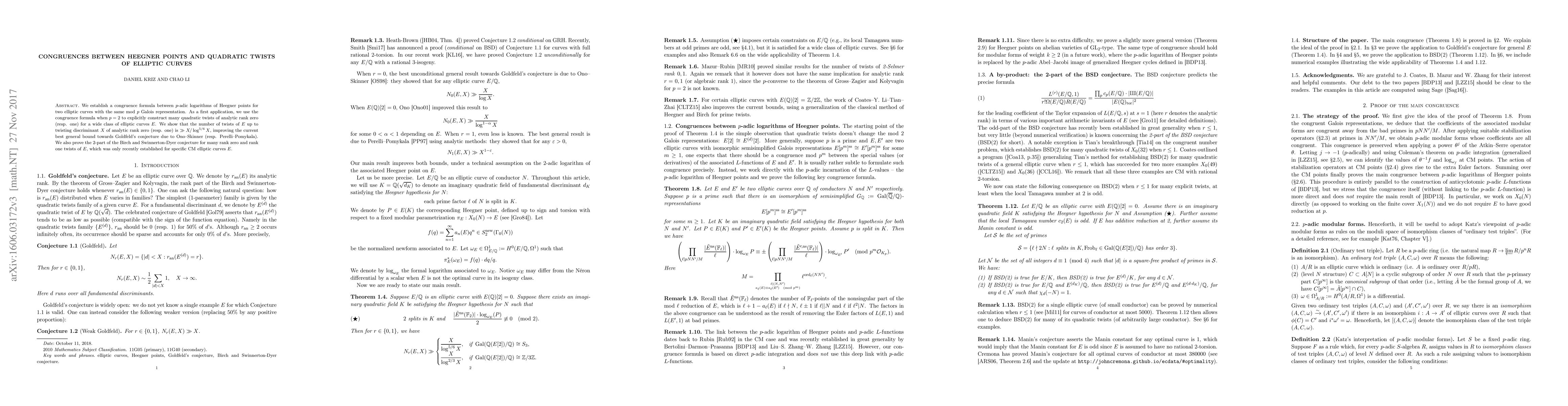 The paper establishes a congruence between $p$-adic logarithms of Heegner points for elliptic curves sharing the same mod $p$ Galois representation, applying this to construct many quadratic twists of analytic rank zero or one. It improves existing bounds towards Goldfeld's conjecture and proves the 2-part of the Birch and Swinnerton-Dyer conjecture for these twists.