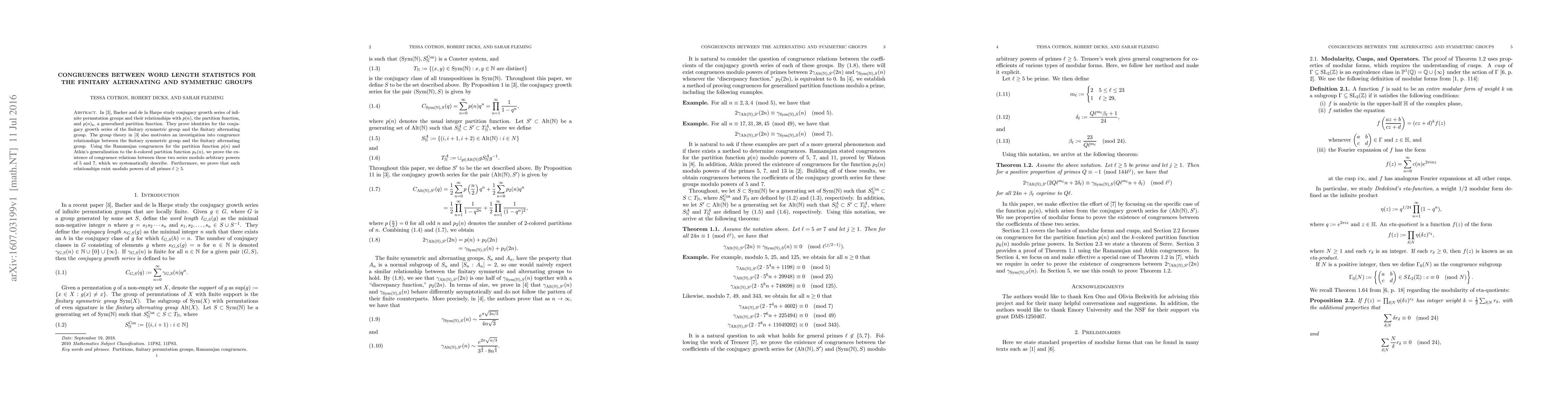 Researchers found congruence relationships between word length statistics for the finitary alternating and symmetric groups, using Ramanujan congruences and Atkin's generalization to describe these connections modulo powers of 5, 7, and all primes >= 5.