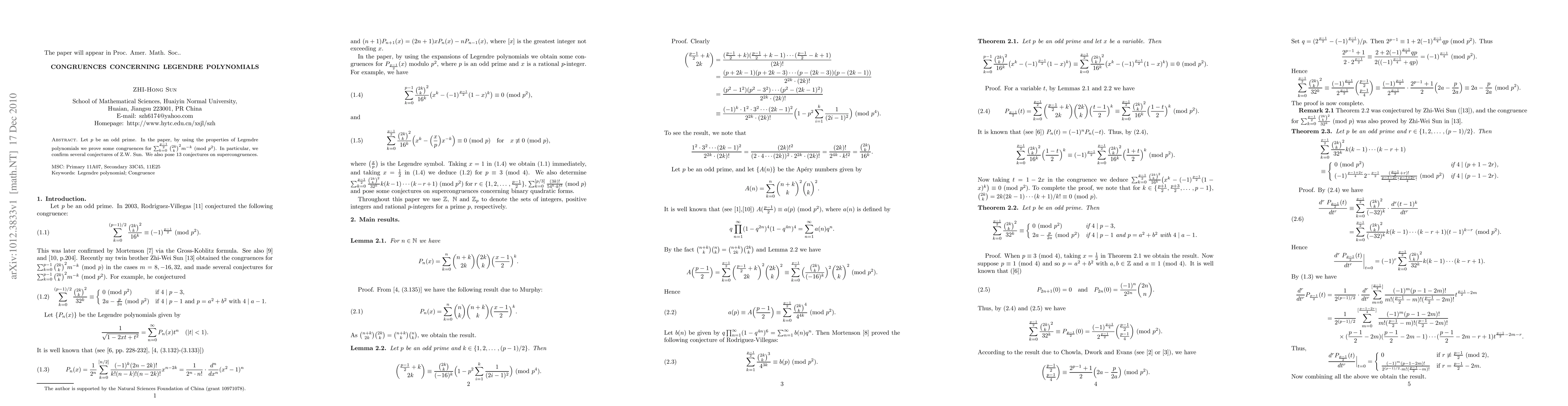Let $p$ be an odd prime. In the paper, by using the properties of Legendre polynomials we prove some congruences for $\sum_{k=0}^{\frac{p-1}2}\binom{2k}k^2m^{-k}\mod {p^2}$. In particular, we confirm several conjectures of Z.W. Sun. We also pose 13 conjectures on supercongruences.