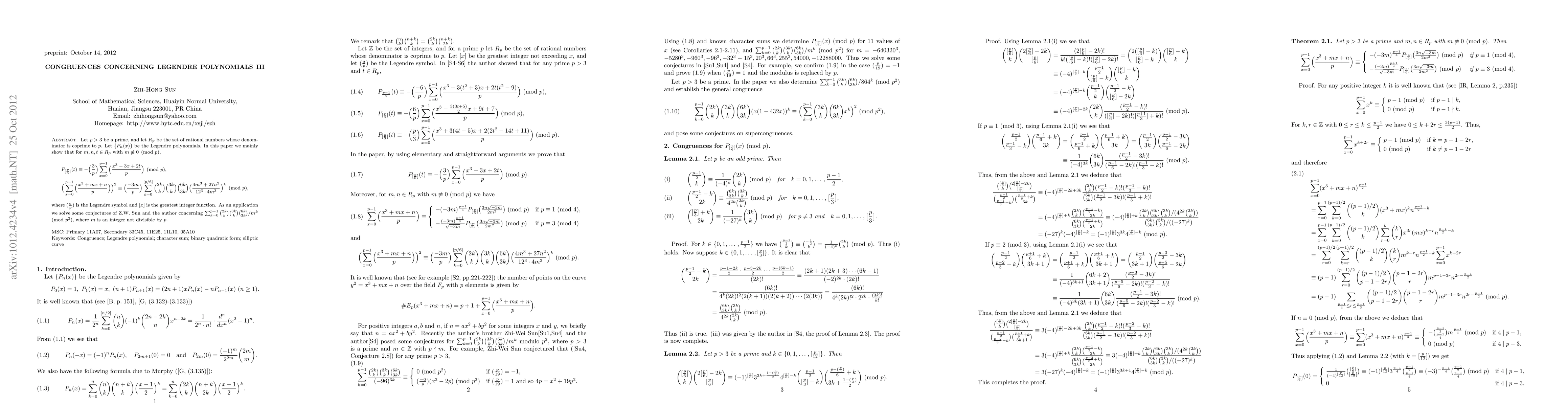 Let $p>3$ be a prime, and let $R_p$ be the set of rational numbers whose denominator is coprime to $p$. Let $\{P_n(x)\}$ be the Legendre polynomials. In this paper we mainly show that for $m,n,t\in R_p$ with $m\not\e 0\pmod p$, $$\align &P_{[\frac p6]}(t) \e -\Big(\frac 3p\Big)\sum_{x=0}^{p-1}\Big(\frac{x^3-3x+2t}p\Big)\pmod p, &\Big(\sum_{x=0}^{p-1}\Big(\frac{x^3+mx+n}p\Big)\Big)^2\equiv \Big(\frac{-3m}p\Big) \sum_{k=0}^{[p/6]}\binom{2k}k\binom{3k}k\binom{6k}{3k} \Big(\frac{4m^3+27n^2}{12^3\cdot 4m^3}\Big)^k\pmod p,$$ where $(\frac ap)$ is the Legendre symbol and $[x]$ is the greatest integer function. As an application we solve some conjectures of Z.W. Sun and the author concerning $\sum_{k=0}^{p-1}\binom{2k}k\binom{3k}k\binom{6k}{3k}/m^k\pmod {p^2}$, where $m$ is an integer not divisible by $p$.