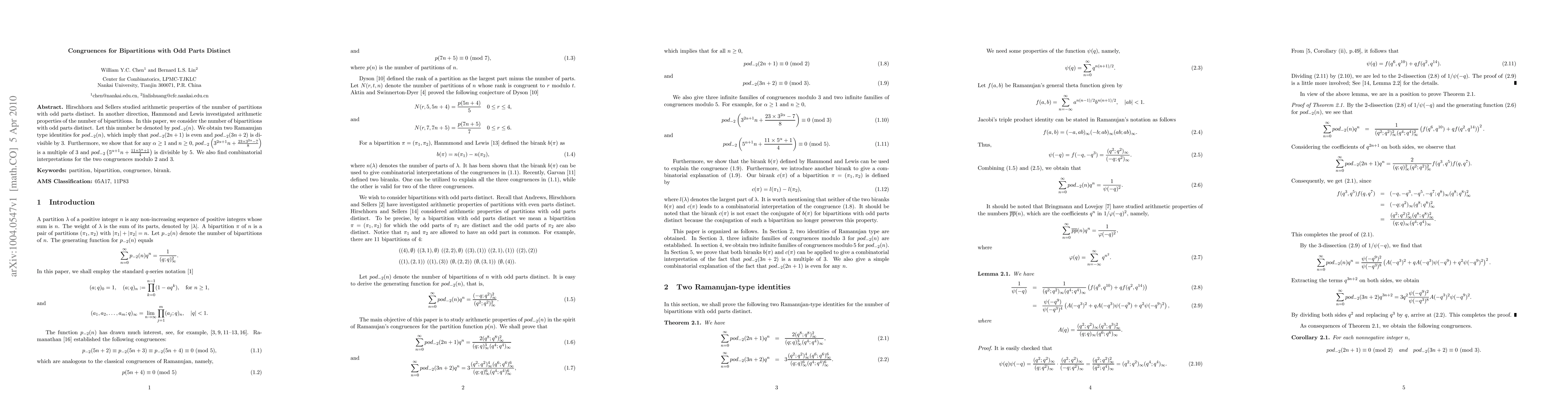 This paper explores congruences for bipartitions where all odd parts are distinct, denoted by $pod_{-2}(n)$. It establishes Ramanujan-type identities, proving that $pod_{-2}(2n+1)$ is even and $pod_{-2}(3n+2)$ is divisible by 3, along with additional divisibility properties for specific forms of $n$.