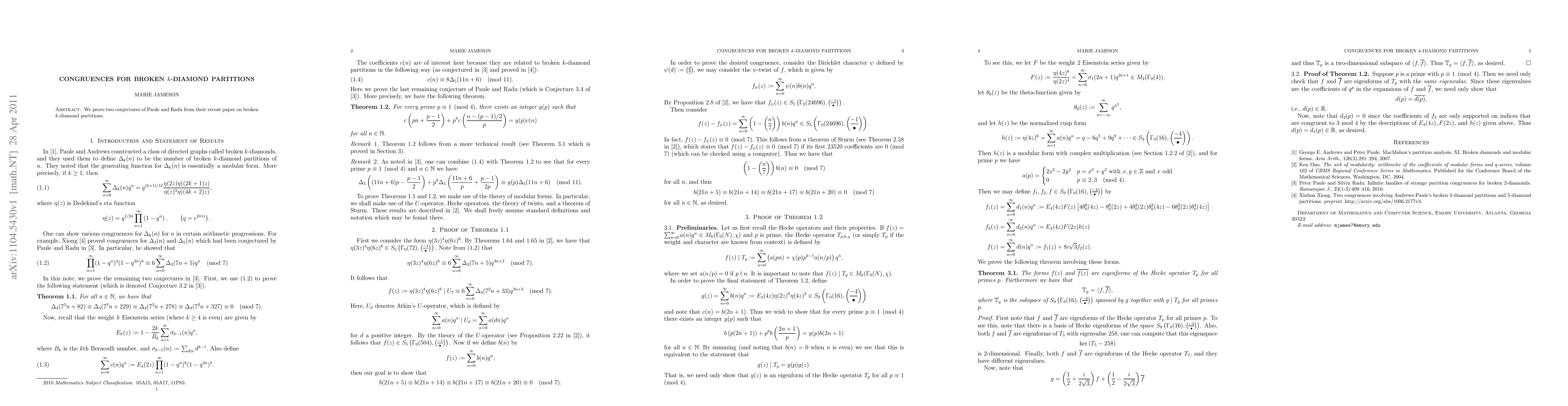 Summary: This paper proves two conjectures regarding broken k-diamond partitions, extending the work of Paule and Radu on partition structures. The results provide new insights into the combinatorial properties of these partitions.