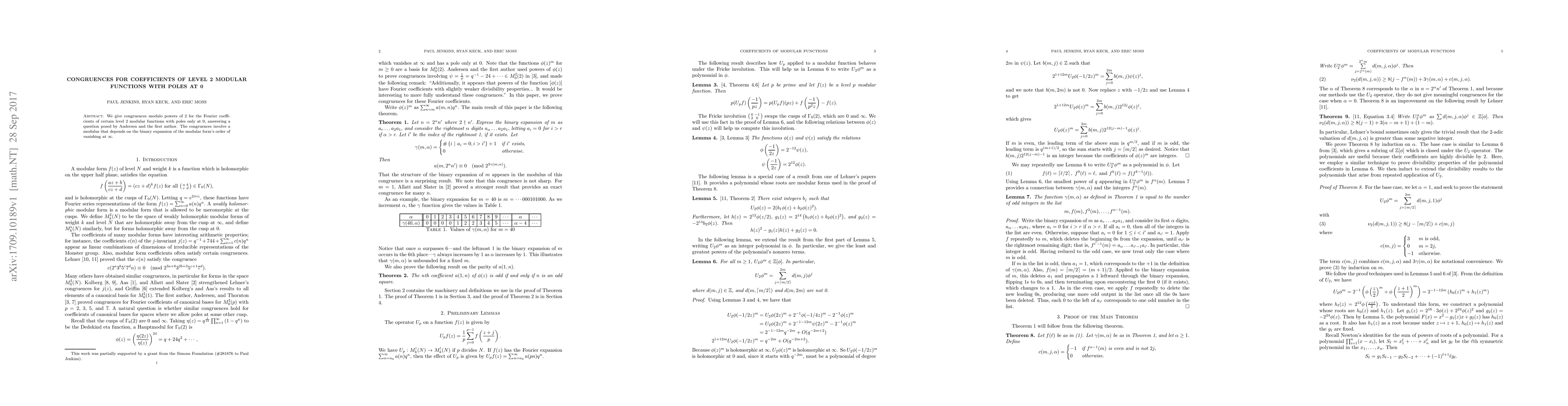 Summary: This paper provides congruences modulo powers of 2 for the Fourier coefficients of specific level 2 modular functions with poles only at 0, addressing a question by Andersen and the first author. The modulus of these congruences is linked to the binary expansion of the modular form's order of vanishing at infinity.