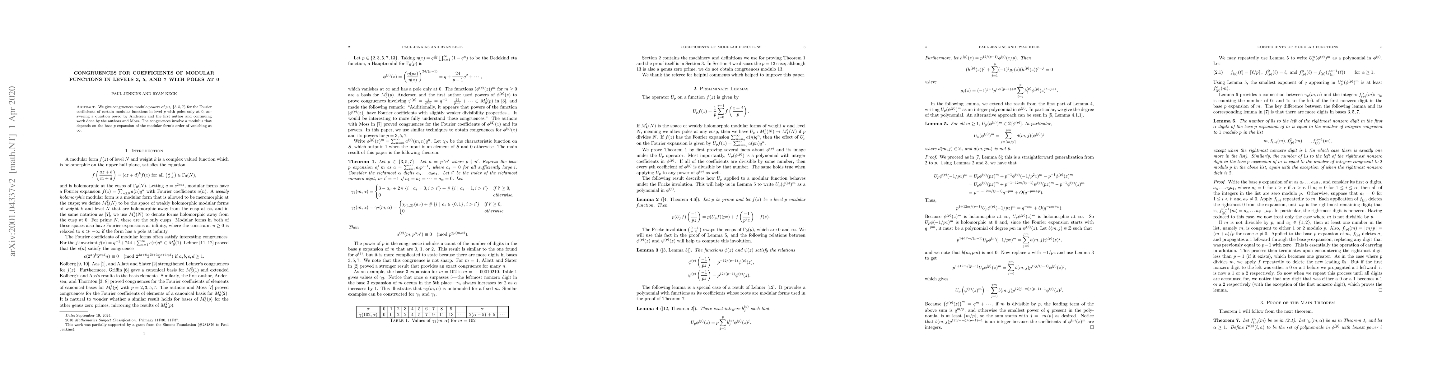 Summary: This paper provides congruences for Fourier coefficients of modular functions in levels 3, 5, and 7, specifically for those with poles only at 0, answering a question posed by Andersen and the first author. The congruences depend on the base $p$ expansion of the modular form's order of vanishing at infinity.