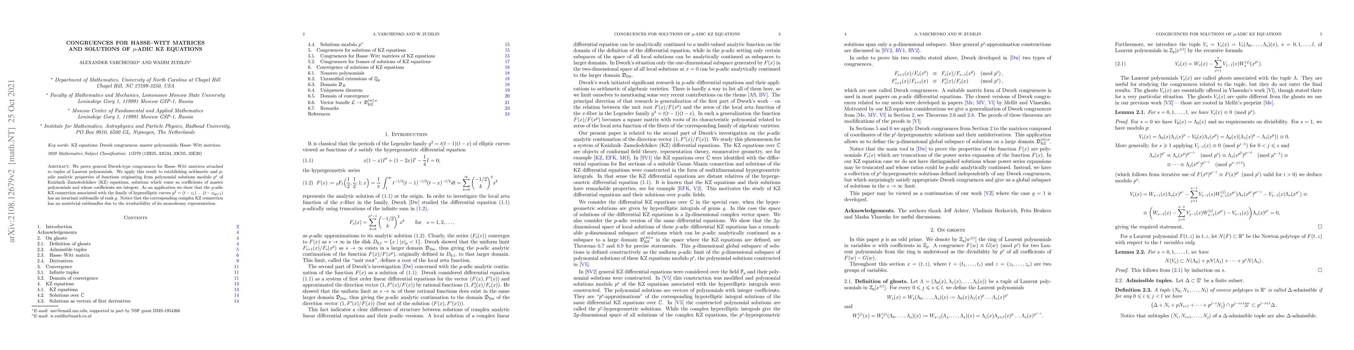 We prove general Dwork-type congruences for Hasse--Witt matrices attached to tuples of Laurent polynomials. We apply this result to establishing arithmetic and $p$-adic analytic properties of functions originating from polynomial solutions modulo $p^s$ of Knizhnik--Zamolodchikov (KZ) equations, solutions which come as coefficients of master polynomials and whose coefficients are integers. As an application we show that the $p$-adic KZ connection associated with the family of hyperelliptic curves $y^2=(t-z_1)\dots (t-z_{2g+1})$ has an invariant subbundle of rank $g$. Notice that the corresponding complex KZ connection has no nontrivial subbundles due to the irreducibility of its monodromy representation.