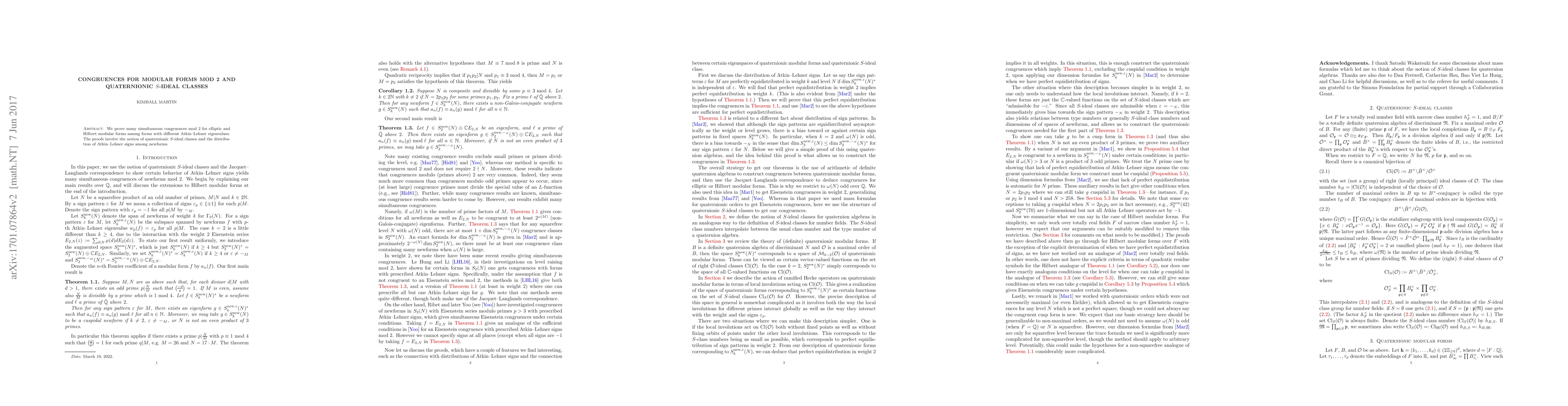 We prove many simultaneous congruences mod 2 for elliptic and Hilbert modular forms among forms with different Atkin--Lehner eigenvalues. The proofs involve the notion of quaternionic $S$-ideal classes and the distribution of Atkin--Lehner signs among newforms.