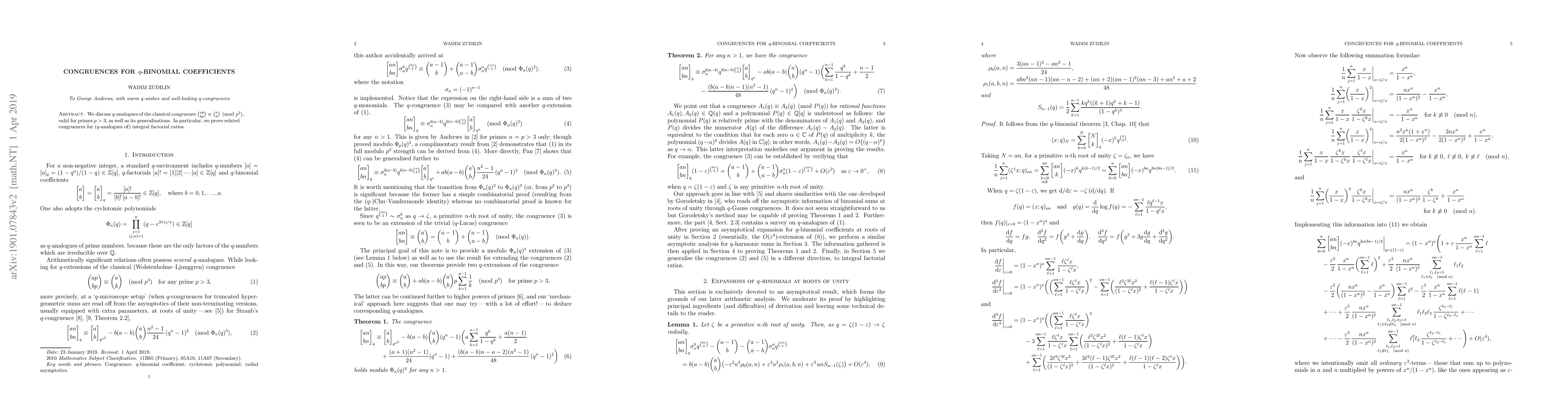 We discuss $q$-analogues of the classical congruence $\binom{ap}{bp}\equiv\binom{a}{b}\pmod{p^3}$, valid for primes $p>3$, as well as its generalisations. In particular, we prove related congruences for ($q$-analogues of) integral factorial ratios.