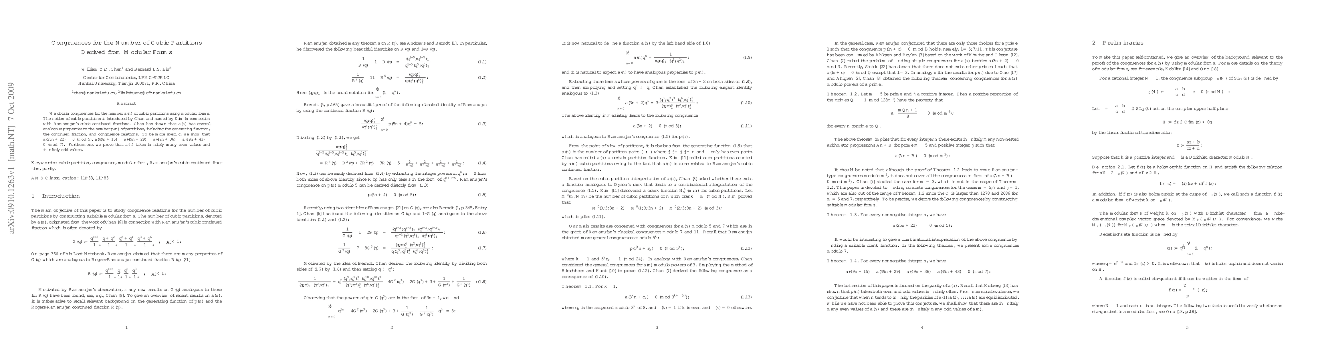 We obtain congruences for the number a(n) of cubic partitions using modular forms. The notion of cubic partitions is introduced by Chan and named by Kim in connection with Ramanujan's cubic continued fractions. Chan has shown that a(n) has several analogous properties to the number p(n) of partitions, including the generating function, the continued fraction, and congruence relations. To be more specific, we show that $a(25n+22)\equiv 0 ({\rm mod} 5)$, $a(49n+15) \equiv a(49n+29) \equiv a(49n+36) \equiv a(49n+43) \equiv 0 ({\rm mod} 7)$. Furthermore, we prove that a(n) takes infinitely many even values and infinitely odd values.