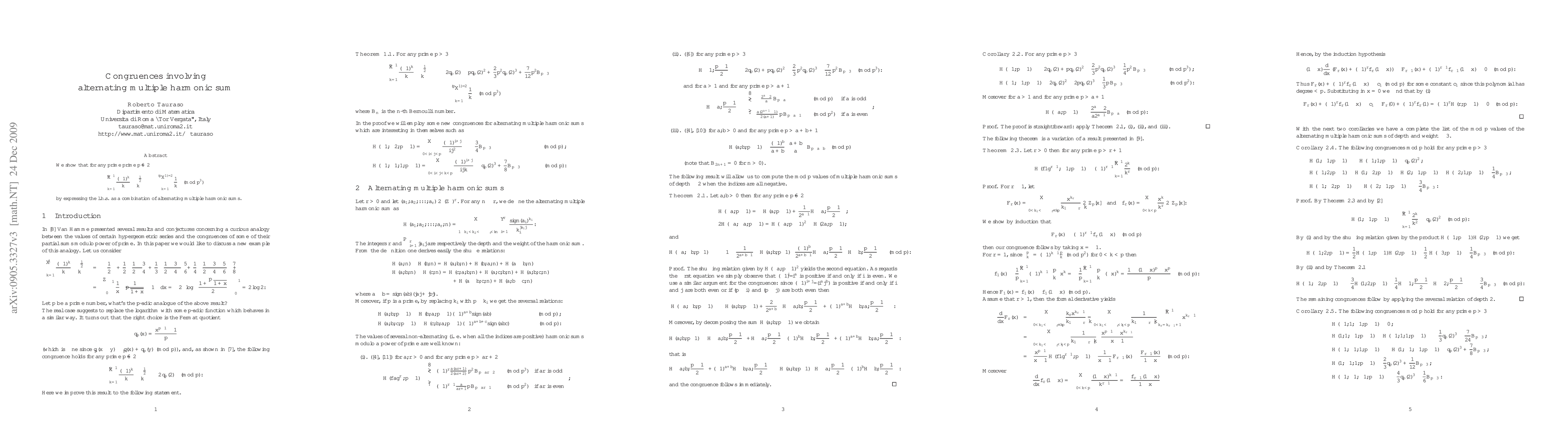 This paper establishes a congruence for primes $p\neq2$ involving alternating multiple harmonic sums, showing that $$\sum_{k=1}^{p-1} {(-1)^k\over k}{-{1\over 2} \choose k} \equiv -\sum_{k=1}^{(p-1)/2}{1\over k} \pmod{p^3}.$$ The left-hand side is expressed in terms of alternating multiple harmonic sums.