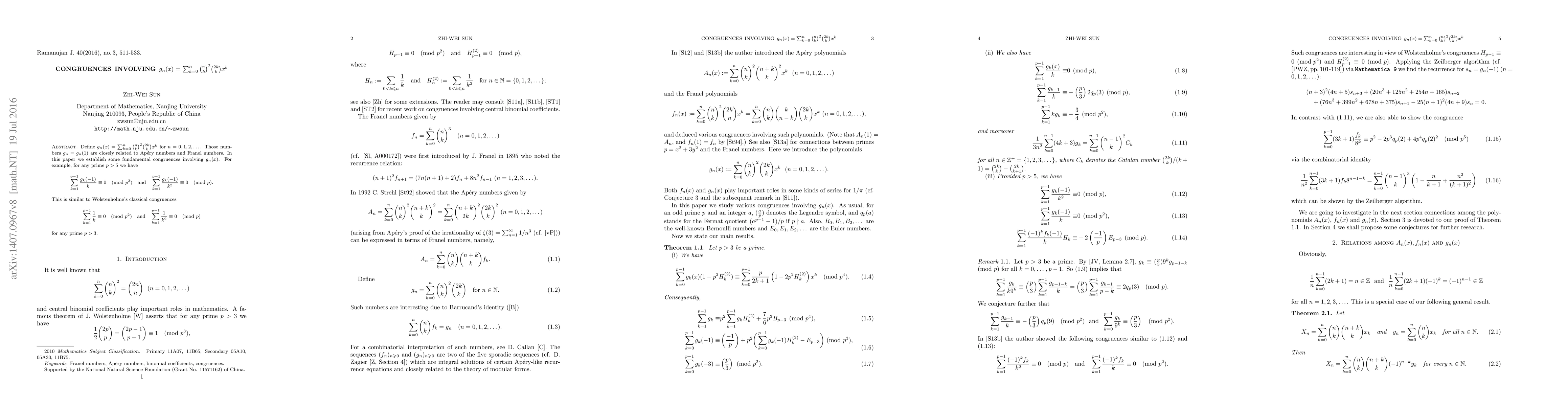 The paper introduces and proves novel congruence relations for $g_n(x)$ and its related sequences, extending known results such as Wolstenholme's theorem.