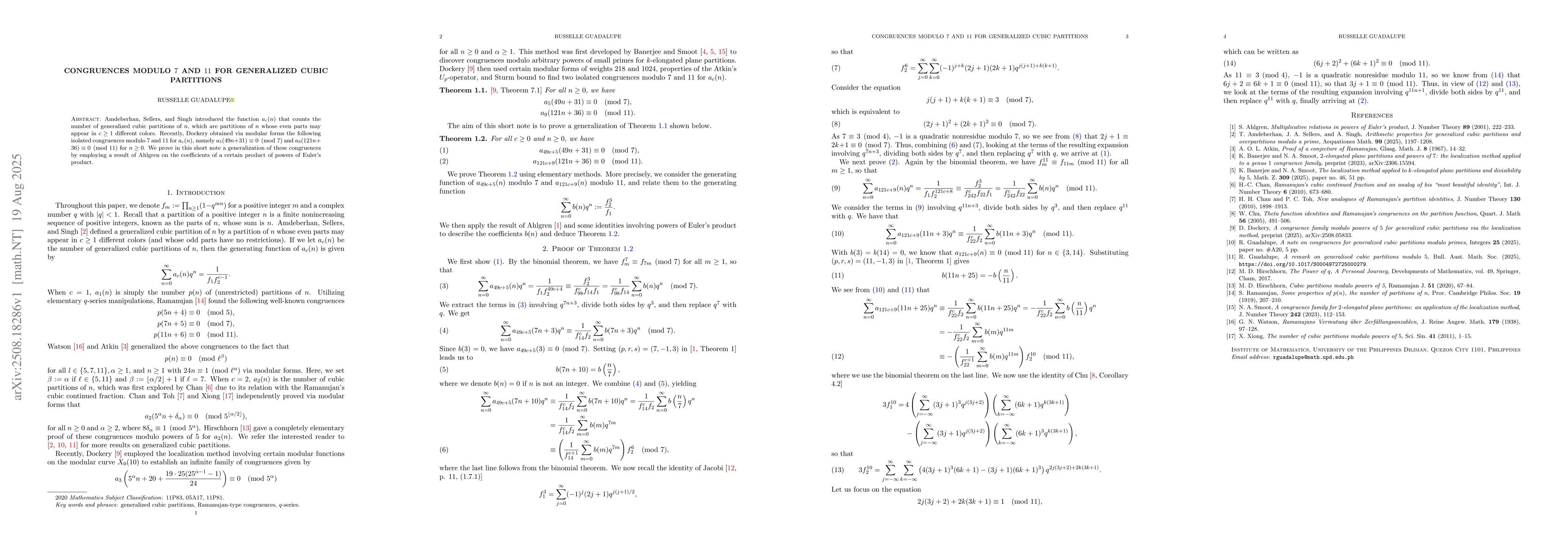 Amdeberhan, Sellers, and Singh introduced the function $a_c(n)$ that counts the number of generalized cubic partitions of $n$, which are partitions of $n$ whose even parts may appear in $c\geq 1$ different colors. Recently, Dockery obtained via modular forms the following isolated congruences modulo $7$ and $11$ for $a_c(n)$, namely $a_5(49n+31)\equiv 0\pmod{7}$ and $a_9(121n+36)\equiv 0\pmod{11}$ for $n\geq 0$. We prove in this short note a generalization of these congruences by employing a result of Ahlgren on the coefficients of a certain product of powers of Euler's product.