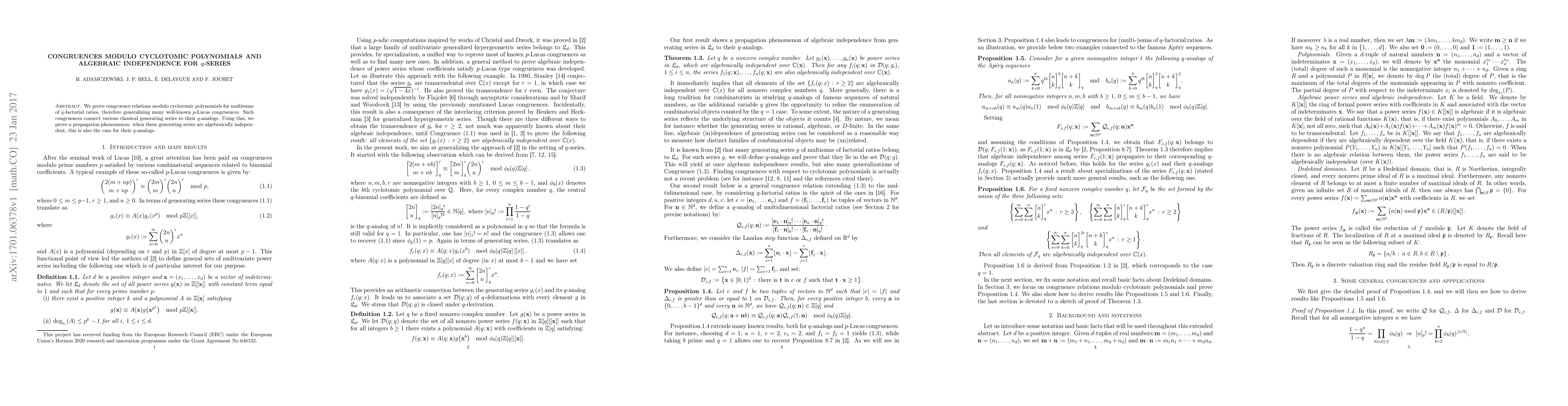 We prove congruence relations modulo cyclotomic polynomials for multisums of $q$-factorial ratios, therefore generalizing many well-known $p$-Lucas congruences. Such congruences connect various classical generating series to their $q$-analogs. Using this, we prove a propagation phenomenon: when these generating series are algebraically independent, this is also the case for their $q$-analogs.