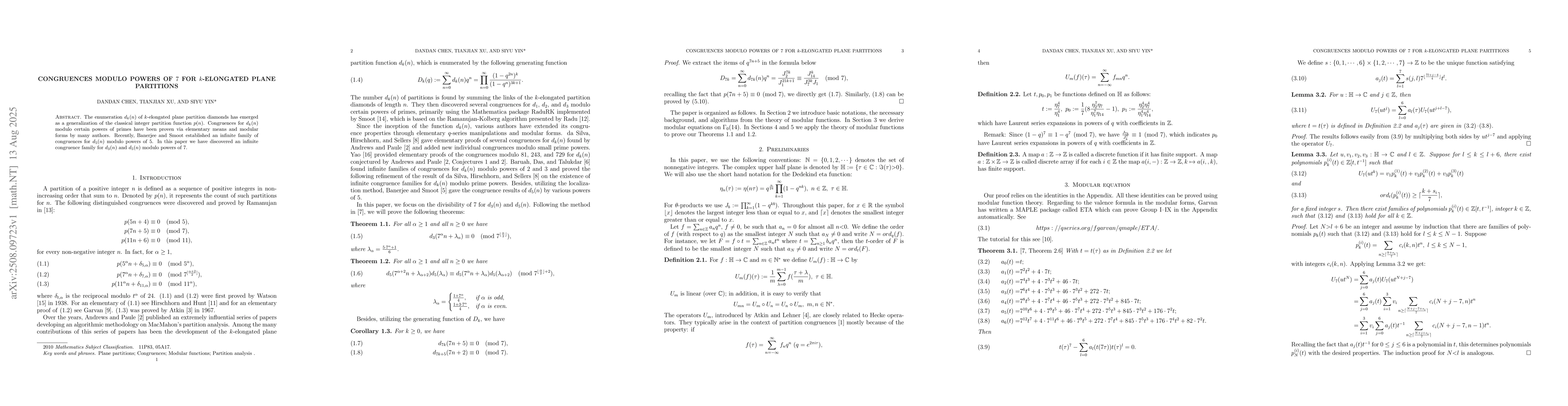 The enumeration $d_k(n)$ of $k$-elongated plane partition diamonds has emerged as a generalization of the classical integer partition function $p(n)$. Congruences for $d_k(n)$ modulo certain powers of primes have been proven via elementary means and modular forms by many authors. Recently, Banerjee and Smoot established an infinite family of congruences for $d_5(n)$ modulo powers of 5. In this paper we have discovered an infinite congruence family for $d_3(n)$ and $d_5(n)$ modulo powers of 7.