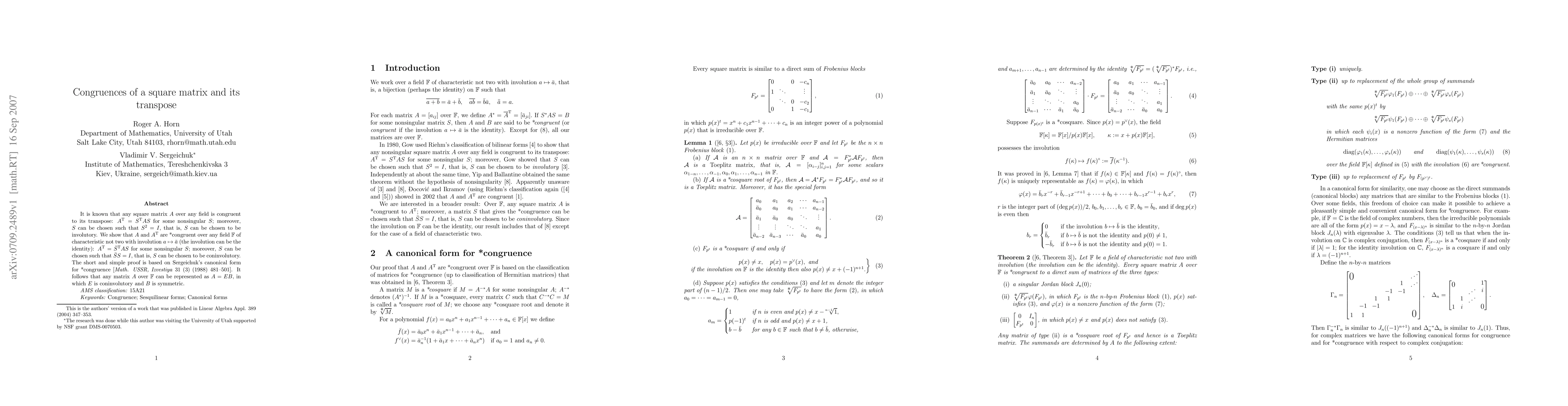 Summary: This paper demonstrates that any square matrix over a field is congruent to its transpose, extending the result to show congruence under any nonidentity involution on the field. This provides a deeper understanding of matrix congruence properties beyond standard transpose relations.
