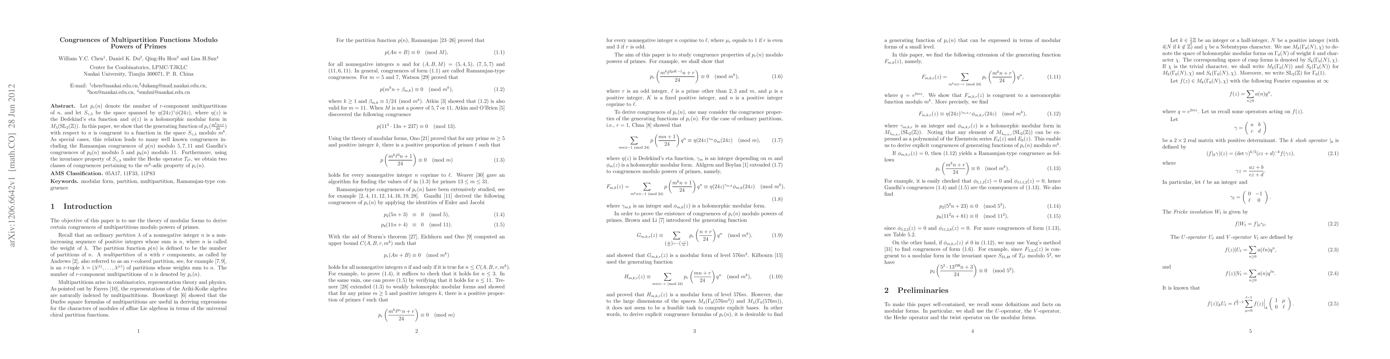 This paper establishes a connection between multipartition functions and modular forms, leading to new congruences for well-known partition functions, as well as insights into the $m^k$-adic property of these functions.