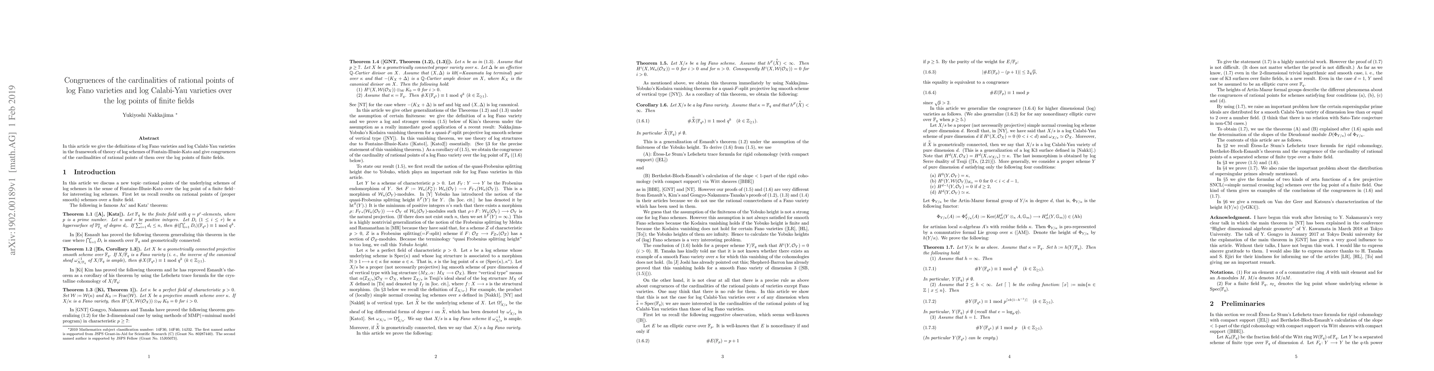 Summary: This research defines log Fano and log Calabi-Yau varieties within the log scheme theory framework and presents congruences regarding the cardinalities of their rational points over finite field log points.