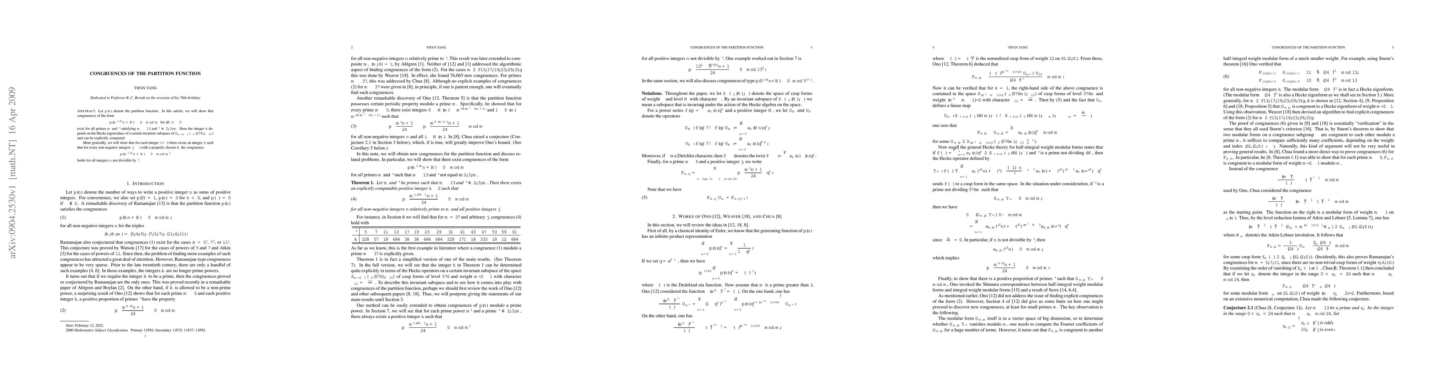 The partition function exhibit congruences of a specific form for primes m and ε greater than or equal to 13, depending on the Hecke eigenvalues of an invariant subspace.