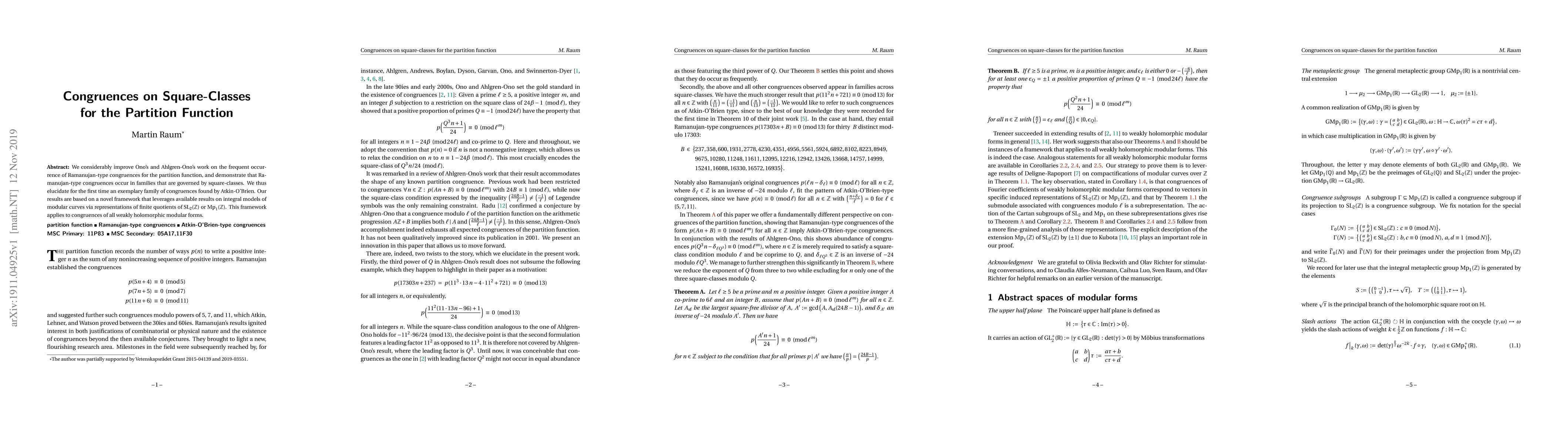 The paper builds upon previous work by Ono and Ahlgren-Ono, improving Ramanujan-type congruences for the partition function by demonstrating their occurrence in families governed by square-classes, using a novel framework based on integral models of modular curves and representations of finite quotients of SL_2(Z) or Mp_1(Z).
