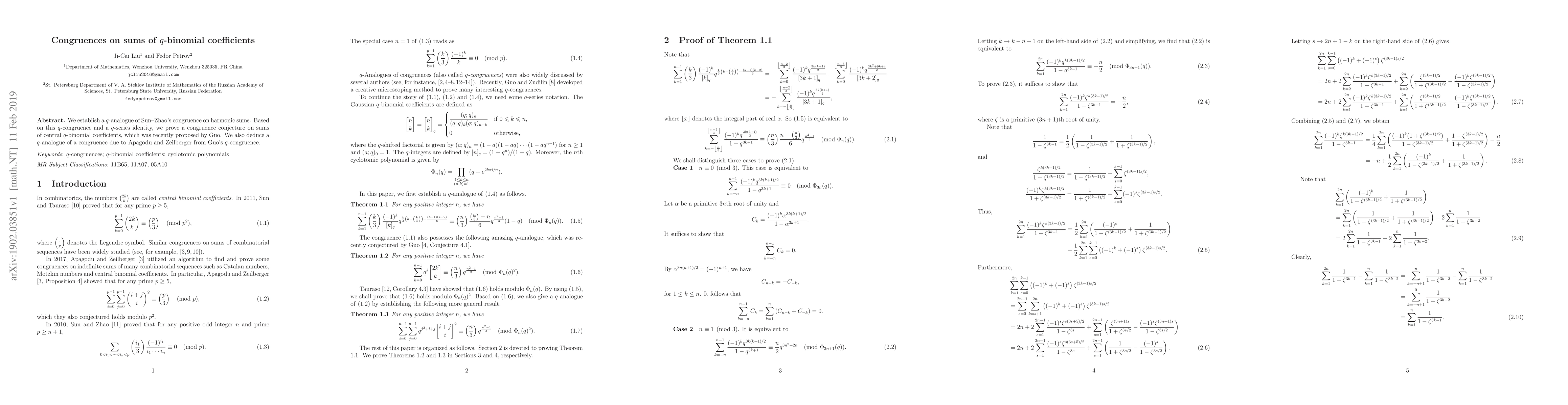 This paper establishes a $q$-analogue of Sun-Zhao's congruence on harmonic sums and uses it to prove Guo's conjecture on sums of central $q$-binomial coefficients, along with deriving a $q$-analogue of a congruence by Apagodu and Zeilberger.