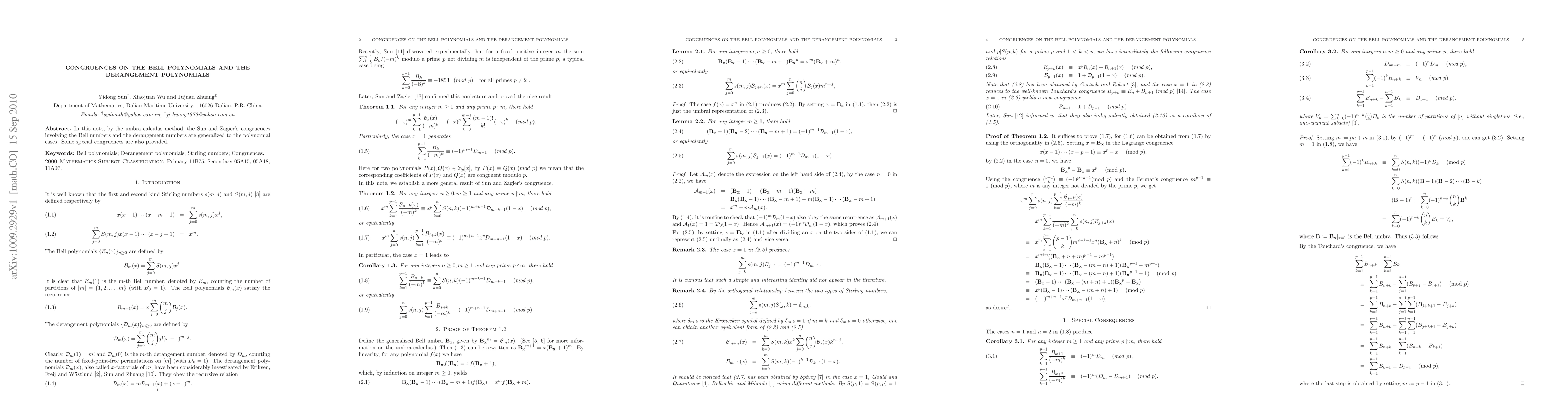In this note, by the umbra calculus method, the Sun and Zagier's congruences involving the Bell numbers and the derangement numbers are generalized to the polynomial cases. Some special congruences are also provided.
